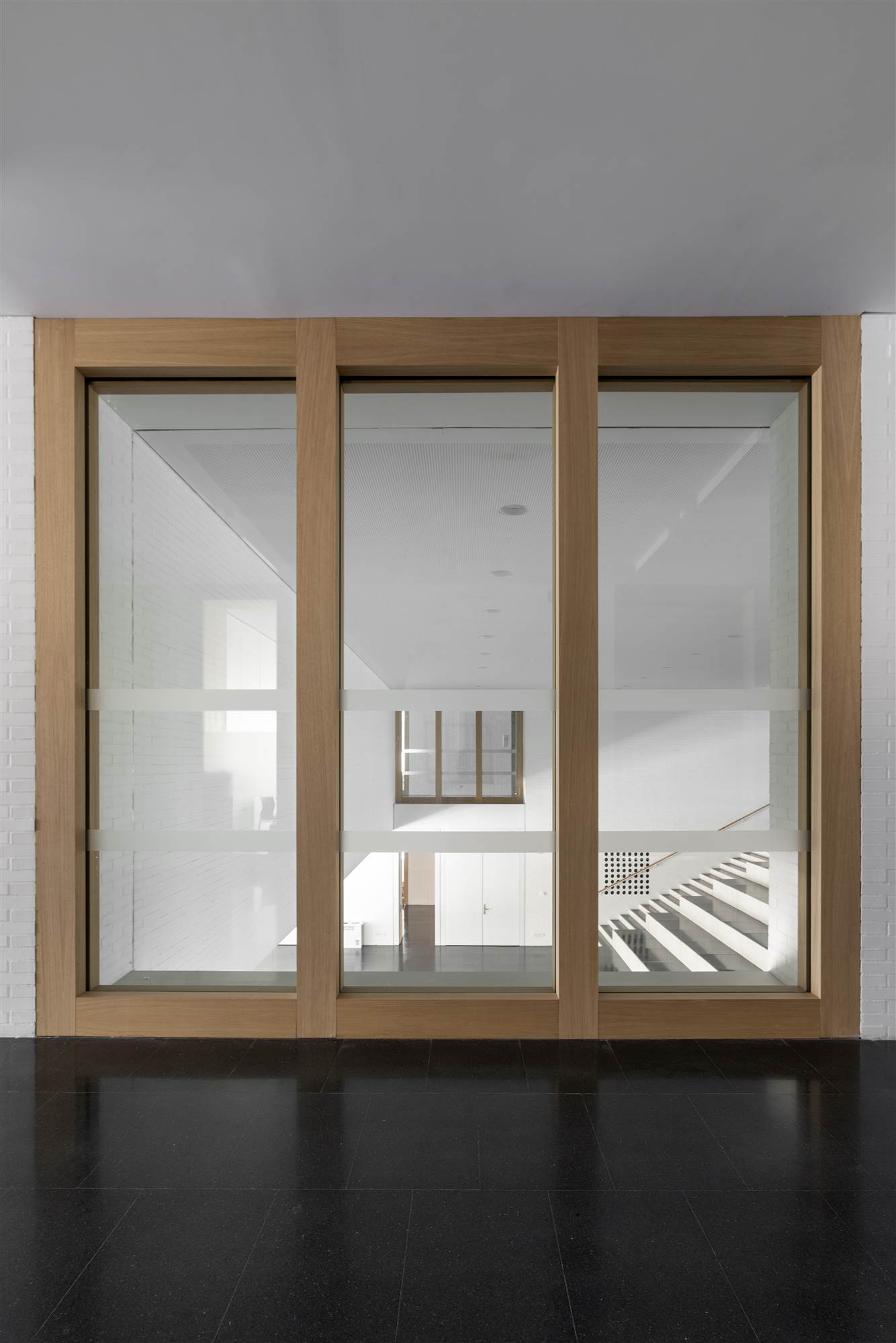 SP: De partida fuimos a un ladrillo blanco, nos decidimos por un ladrillo clínker, y en el proceso de investigación de cómo pintarlo utilizando un mortero blanco para conseguir uniformizar el tono, vimos que el clínker, que es un producto que está curado a muy alta temperatura, casi vitrifica y cristaliza la superficie y no es fácil adherirle una pintura que con el tiempo perdurara. Nosotros, de partida, hubiéramos tirado por una pintura de silicato, que solemos trabajar con el hormigón, pero el resultado de las pruebas de adherencia en el laboratorio no era satisfactorio. Finalmente encontramos al fabricante que hace este recubrimiento en los Países Bajos, pero se iba de precio. Es aun pintura que tiene de base poliuretano y es la que utilizaba Van de Laan en su edificio con la que pinta hasta las puertas.