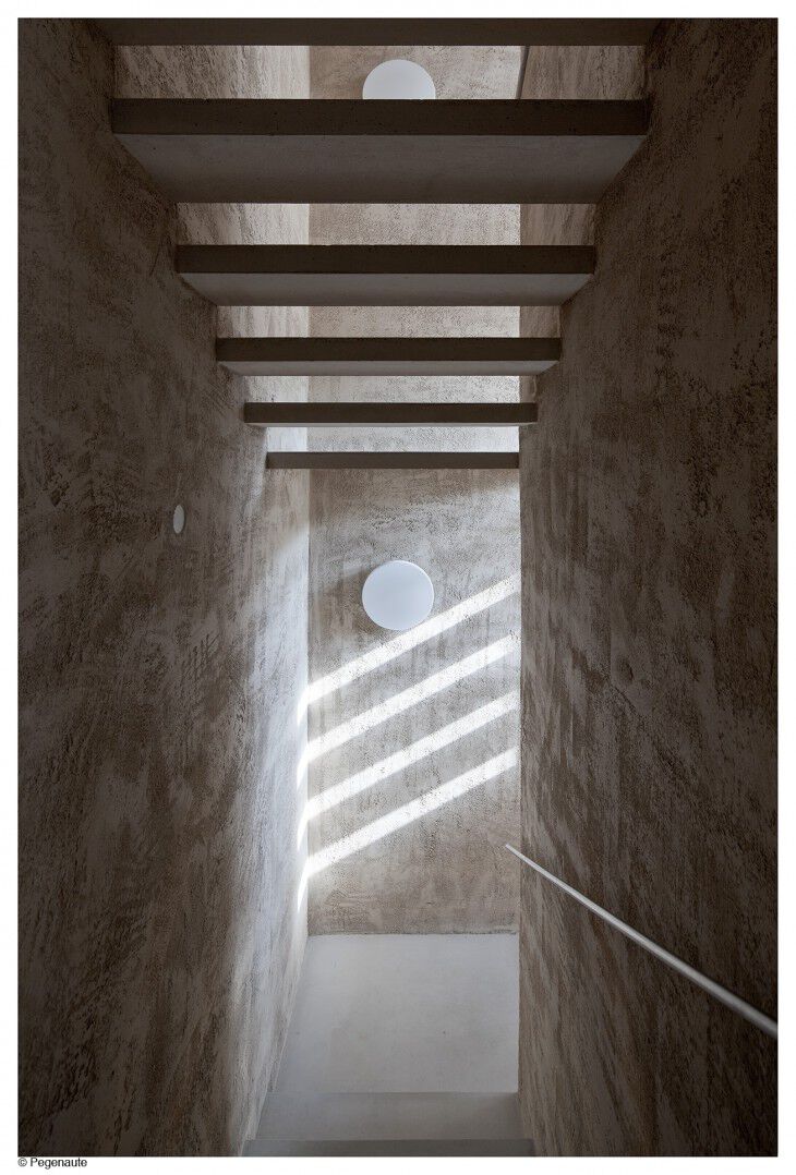 El núcleo de comunicaciones, a pesar de su configuración desde la optimización, entendíamos que podía tener más presencia que una simple sucesión de escalones donde discurre el movimiento de subir o bajar. Ésta se formalizó con una pisas de hormigón que dejaban libres las tabicas y por tanto permitió el paso de la luz: entender la escalera como un espacio singular más allá de lo funcional y ganar el profundidad visual a pesar de su reducido tamaño.