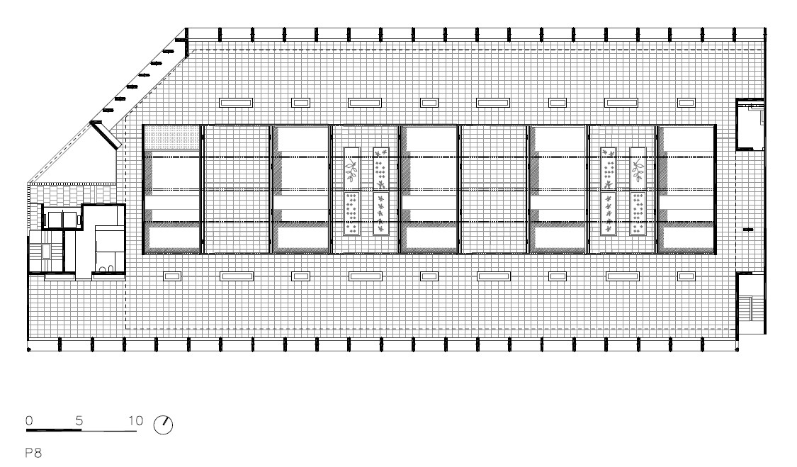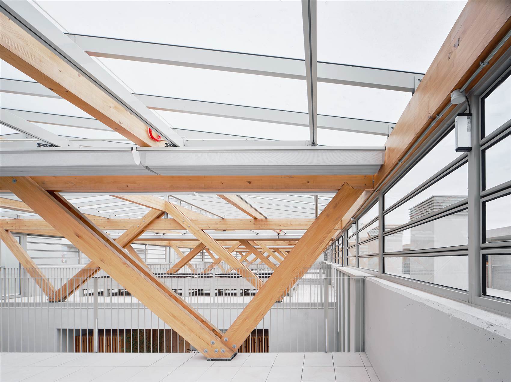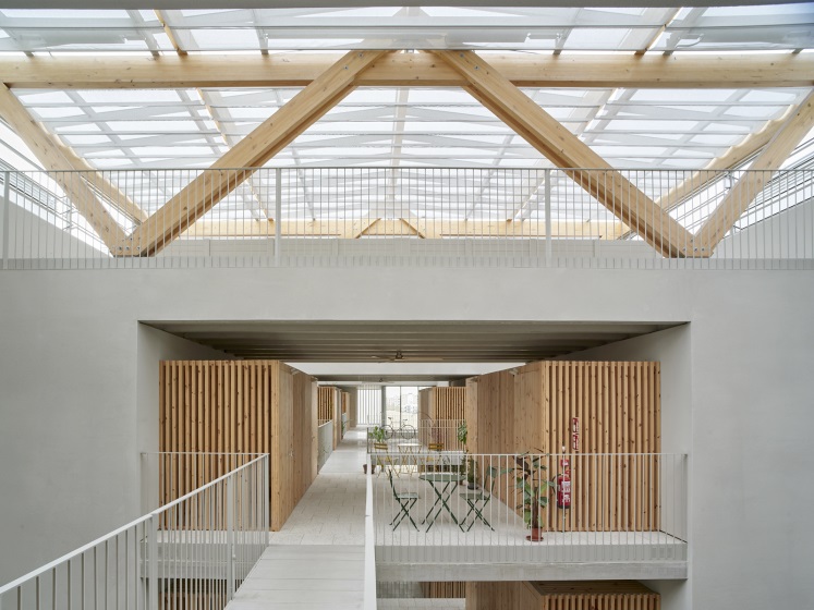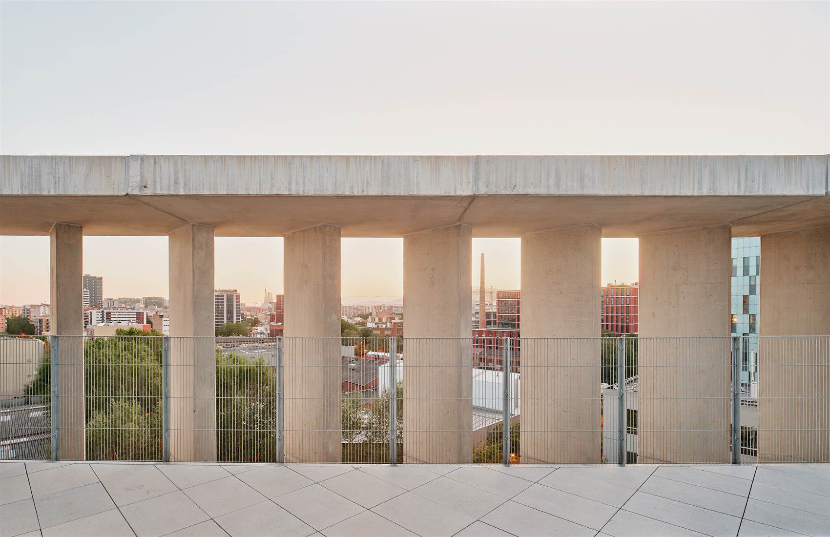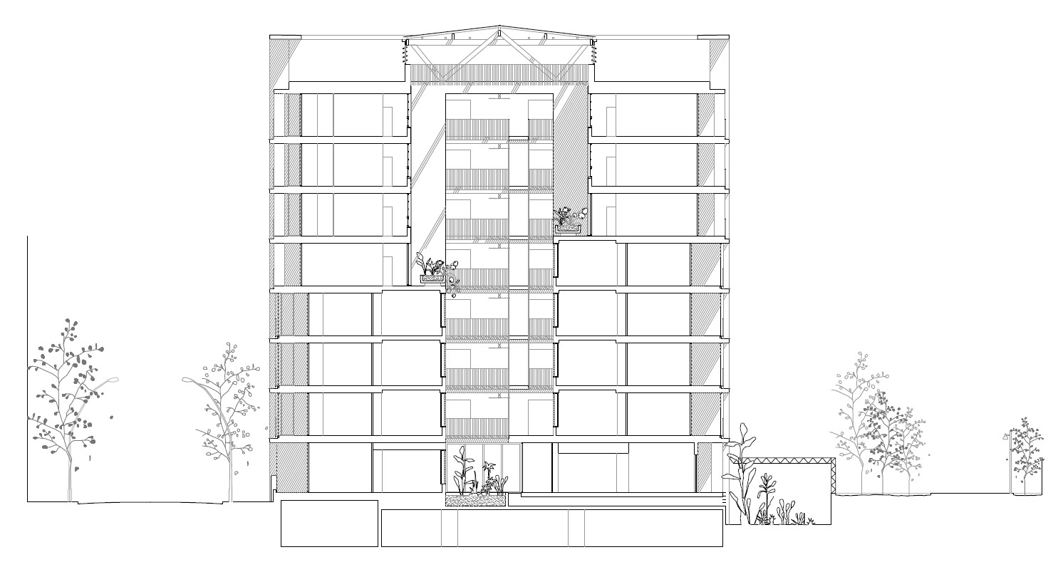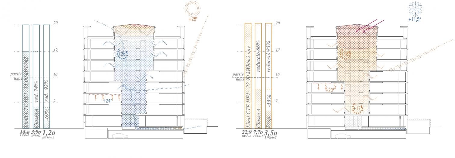 "En la octava planta se ubica el programa colectivo de las viviendas senior, que incluye lavandería comunitaria, tendederos, solárium, huertos urbanos y espacios polivalentes. Por encima, una gran cubierta de vidrio envuelve los cinco patios, transformándolos en un gran atrio bioclimático, cuyo comportamiento varía según la estación: funciona como captador de calor en invierno y como chimenea solar en verano. Este esponjamiento interno constituye una estrategia medioambiental para reducir la demanda energética de forma pasiva, y actúa a la vez como condensador social".(Memoria del proyecto)