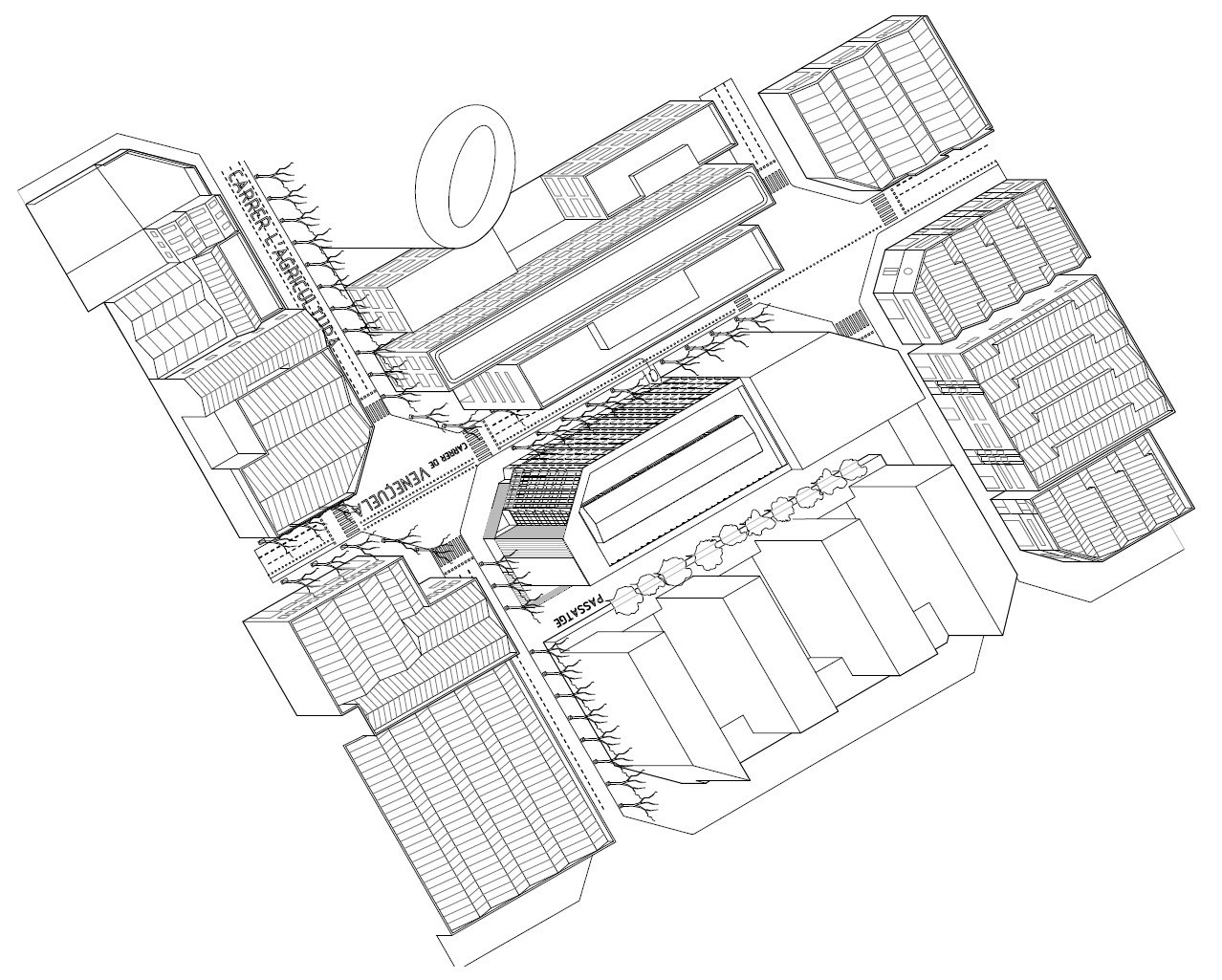 Axonometría del edificio y su entorno urbano. Ver PDF
