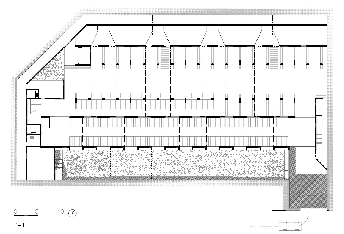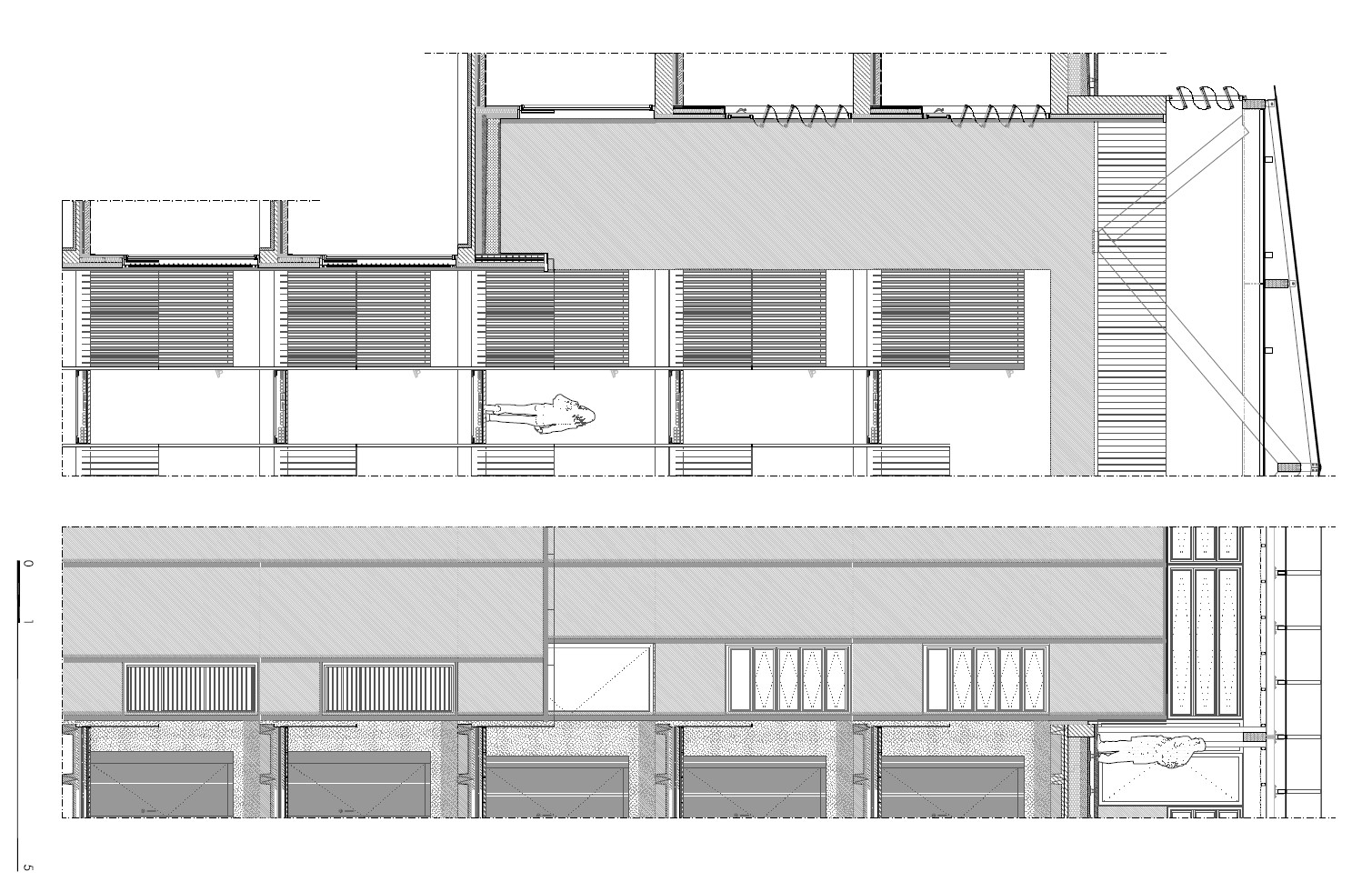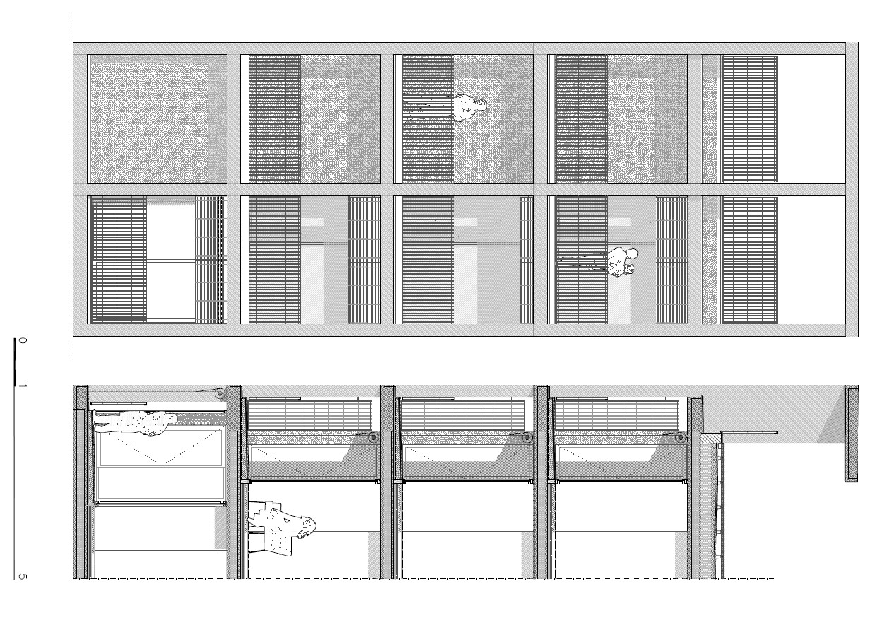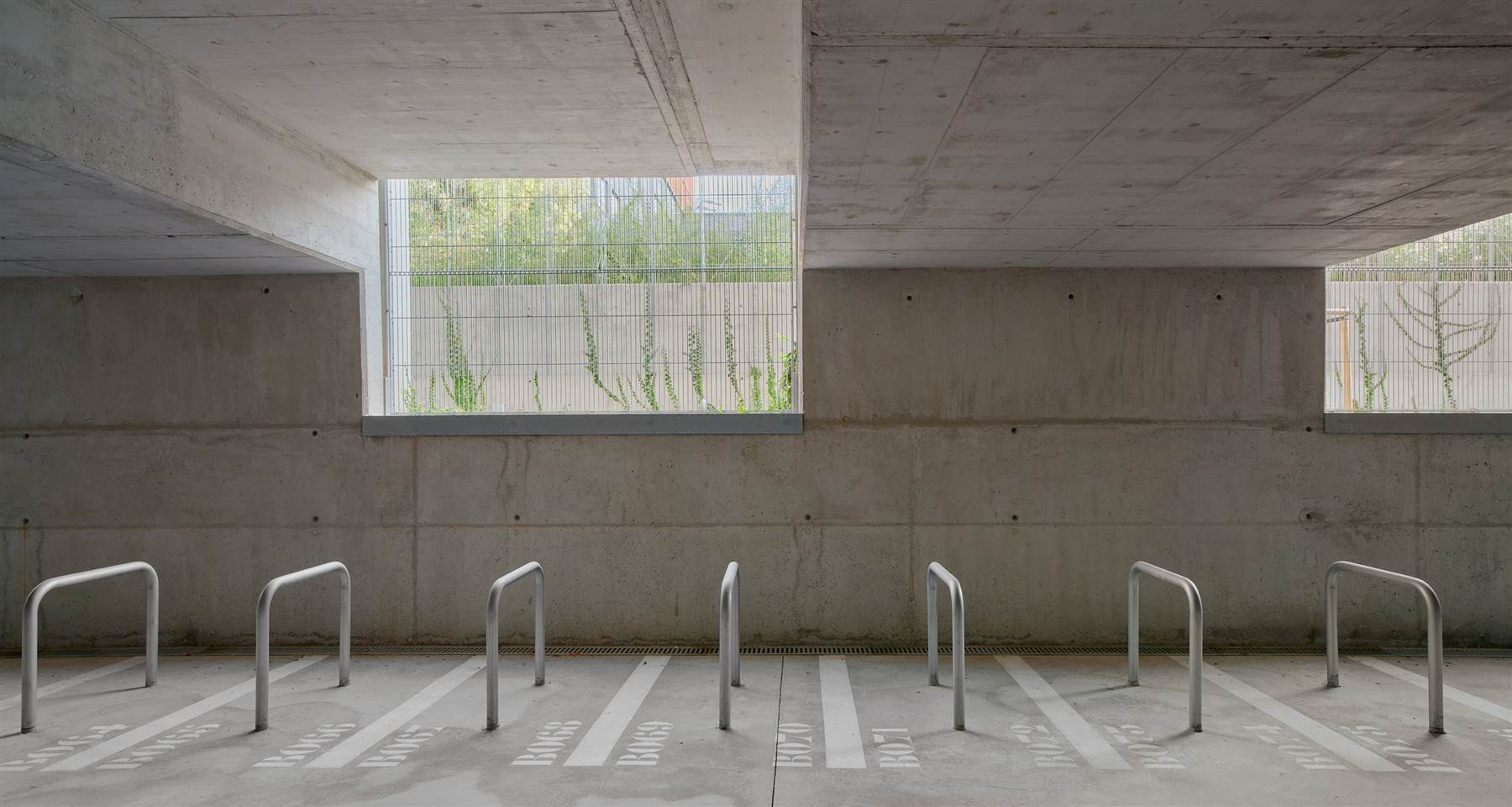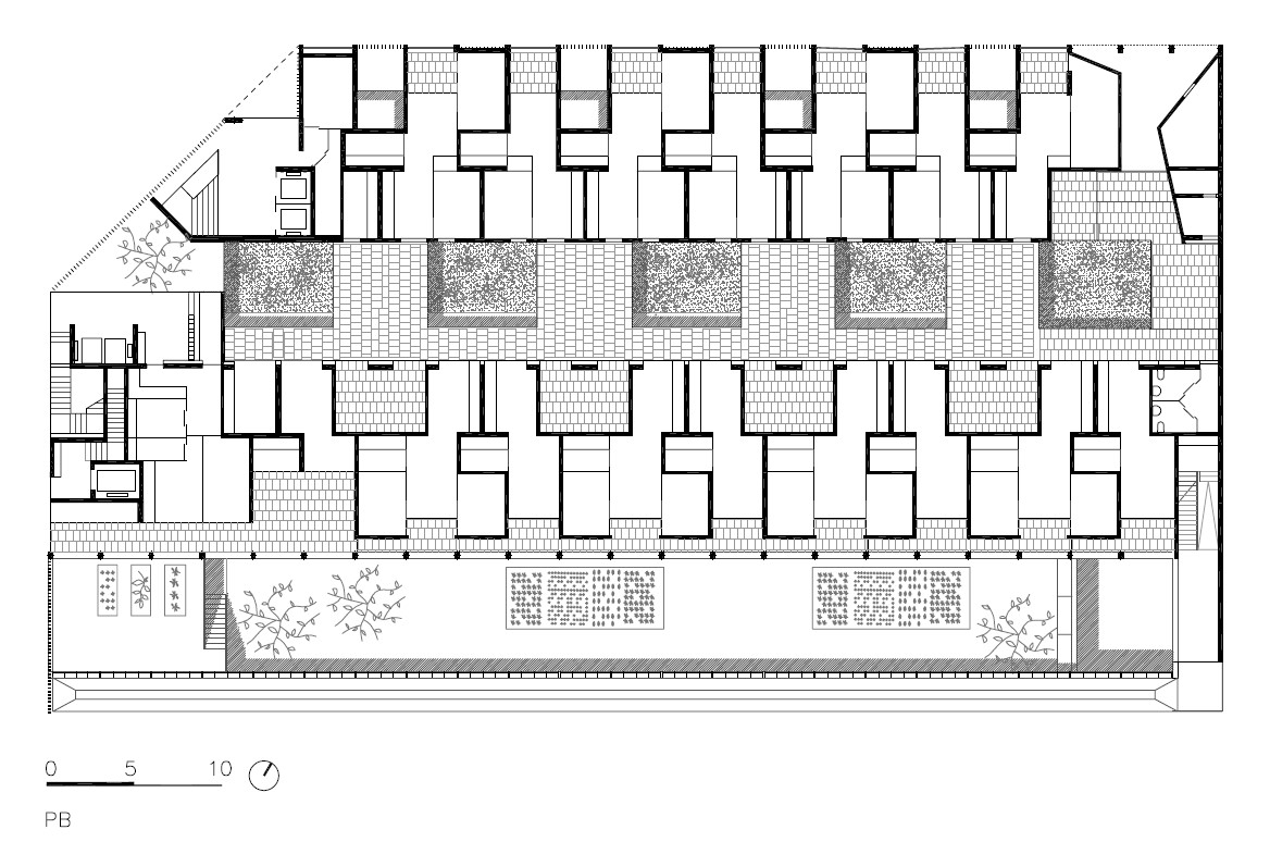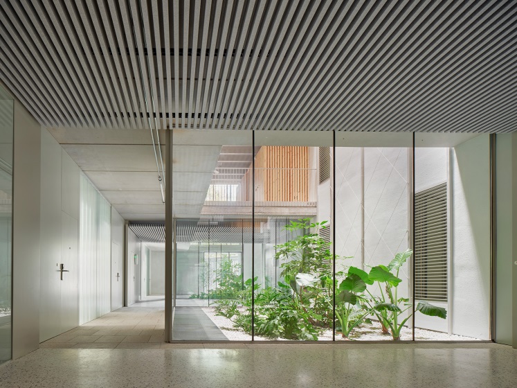 "En la planta baja, un patio inglés ajardinado en contacto con el pasaje permite la iluminación natural y ventilación cruzada del aparcamiento, capaz de adaptarse a nuevos usos en el futuro, y aporta una entrada de aire al atrio, clave en su comportamiento termodinámico. La inercia térmica de la estructura prefabricada de hormigón, la higroscopicidad de la madera y la absorción acústica del revoco de los patios proporcionan confort a este espacio intermedio atemperado". (Memoria del proyecto)