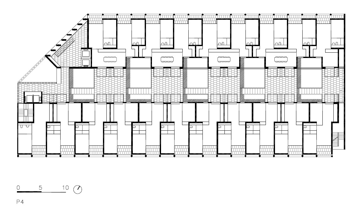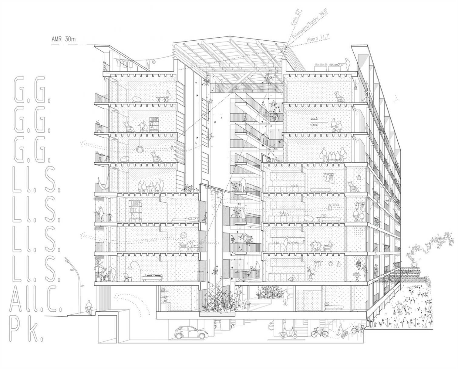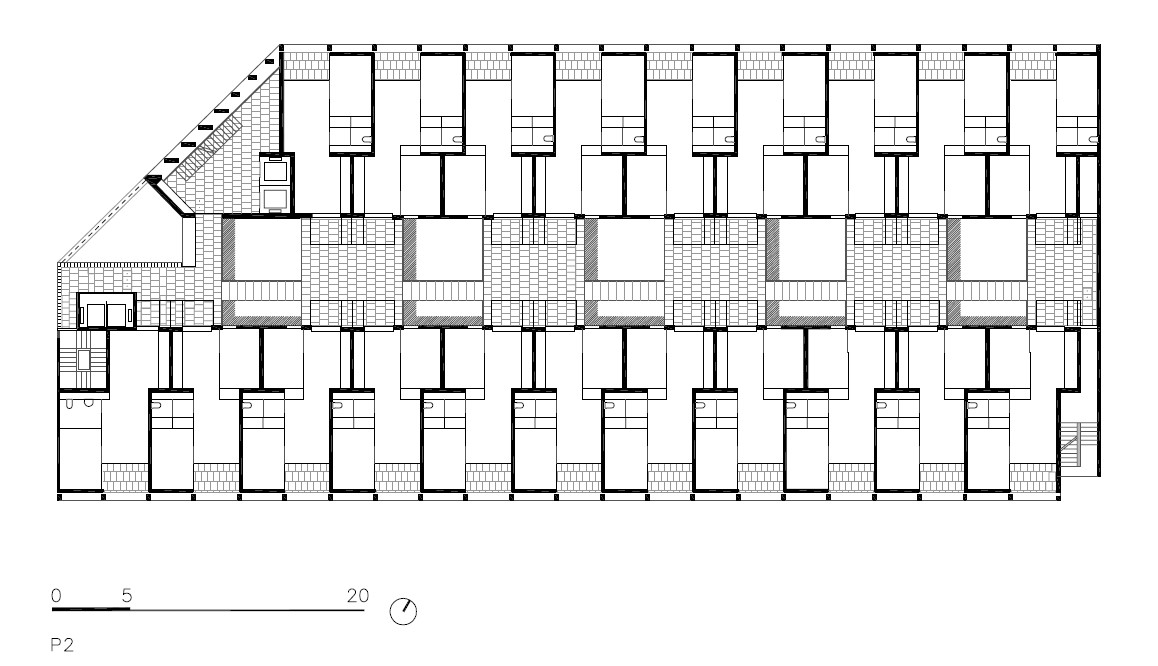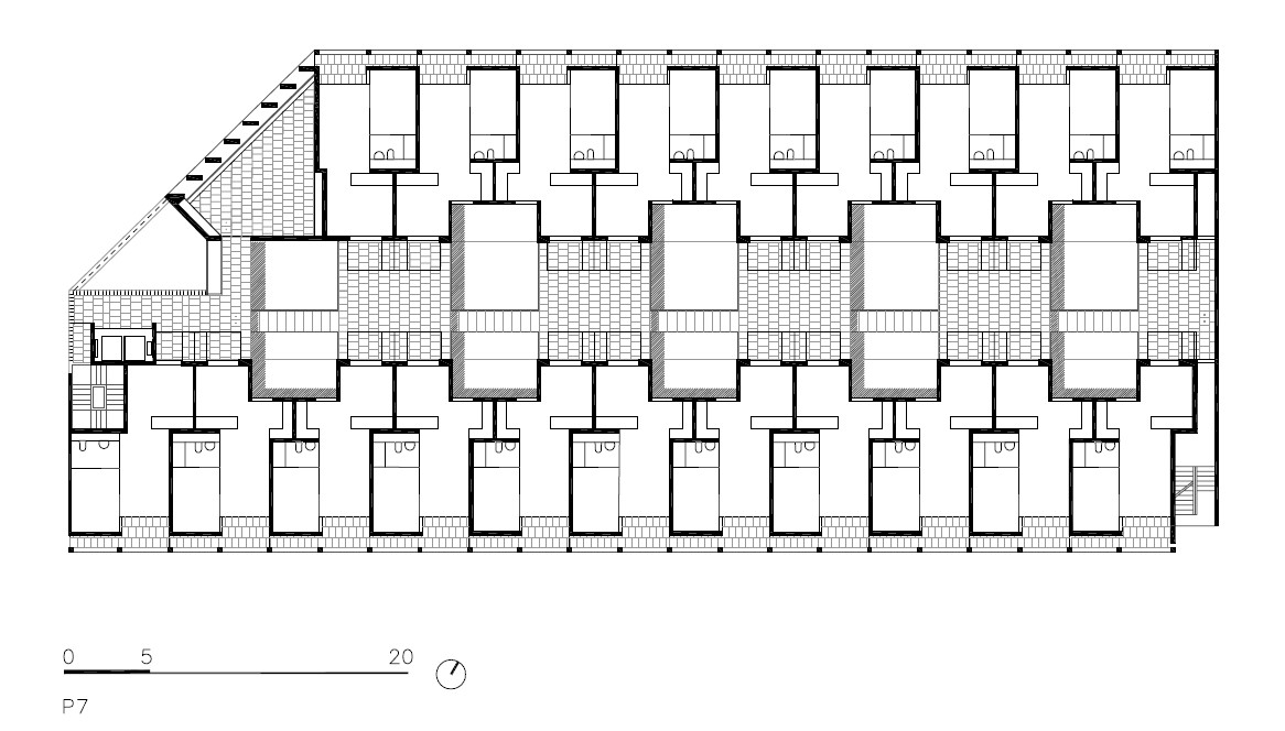 "La planta se organiza en veinte viviendas por nivel, dispuestas alrededor de una pasarela que funciona como calle elevada y atraviesa una secuencia de cinco patios y rellanos de acceso. Cada rellano reúne cuatro entradas, formalizadas mediante unas cajas de celosía de madera que tamizan la vista y el aire, regulando la privacidad y fomentando la apropiación del espacio. La vivienda articula dos espacios en diagonal —la cocina -comedor, vinculada con la entrada y la sala con la terraza— que se conectan directamente con las habitaciones para evitar pasillos". (Memoria del proyecto)