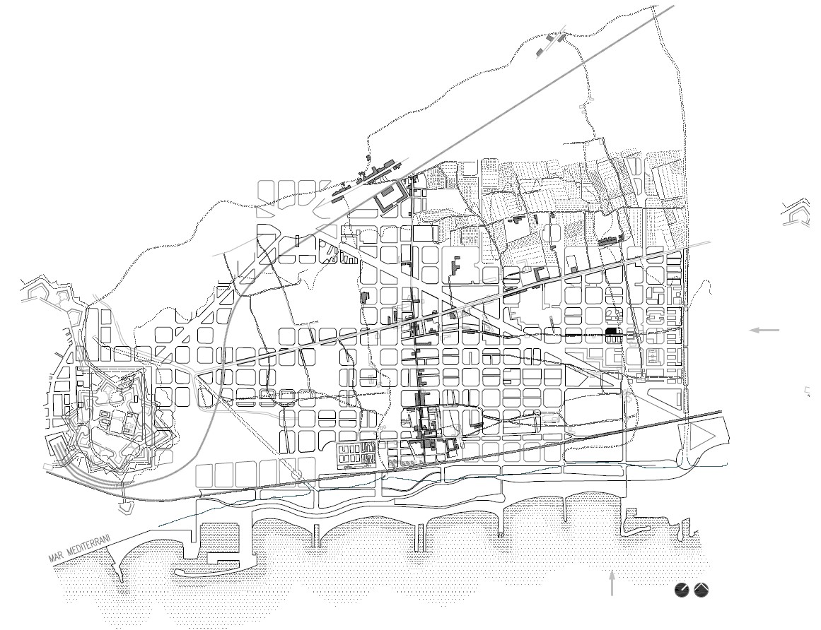 Estos pasajes tienen que ver con la idea de cambiar la escala al Eixample. Se puede ver en el plano esa condición de manzanas con pasajes, en uno de los cuales está este proyecto. Esto nos lleva a entender que, más allá de alinearnos solo a la calle –que era el antiguo Camí Antic de València– como pedía el planeamiento, era importante la idea del pasaje, entenderlo como calle, que es la vocación que se tiene en esta zona del Ensanche de Barcelona. Y por otro lado hacemos que el exceso del volumen edificable se introduzca dentro del edificio, esponjándolo y creando un vacío central, fundamental en el proyecto, y que ya podemos adivinar que va a ser un vacío termodinámico.