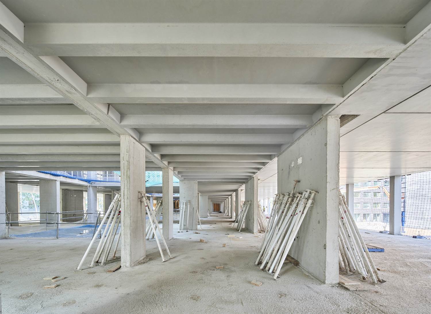 La construcción es en base a todo un sistema de estructura prefabricada que está optimizada con geometría. Esto ya lo definimos en Ibiza. La mejor manera de hacer un hormigón un poco más sostenible era dándole mucha geometría. La prefabricación nos ayuda a darle geometría de forma más económica. Se utilizan unas unas vigas pi, hechas a medida. Con eso tenemos una sección estructural de 30 cm y la cantidad de hormigón equivalente a un forjado de 15 cm. Lo cual implica una reducción del 50% en la cantidad de hormigón.