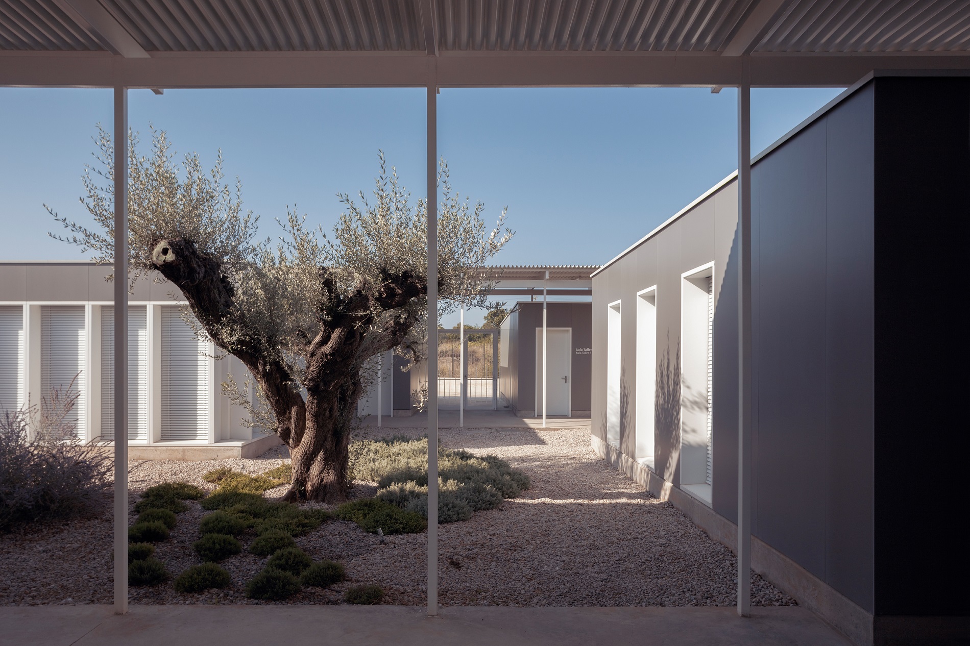 De hecho, ante, por ejemplo, las exigencias singulares por la pandemia, en el patio de ocio hay una zona con la pérgola más alta que permite albergar casi cualquier uso, aulas al aire libre, eventos, presentaciones... lo que sea. Y de esas posibilidades no éramos tan conscientes antes de la pandemia cuando proyectamos el edificio, entonces era más una extensión de la entrada principal con posibilidades funcionales, aunque sí que este tipo de usos exteriores complementarios estaban más pensado en el del patio de talleres, porque la Fundación Laboral desarrolla actividades docentes en varios ámbitos de edificación, obra civil, infraestructuras, etc., por ejemplo, de instalaciones de energías renovables, fotovoltaicas, eólicas, electrónicas..., y ahí, el patio de trabajo funciona muy bien porque se puede tener un aerogenerador montado o unos paneles fotovoltaicos y los alumnos salen directamente del aula al taller, no es necesario subir a la cubierta y no hay que preocuparse por la seguridad. Y todo esto, evidentemente, lo permite el clima.