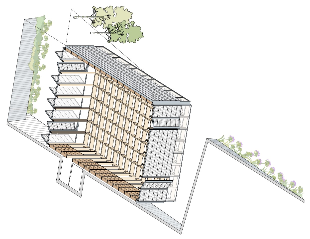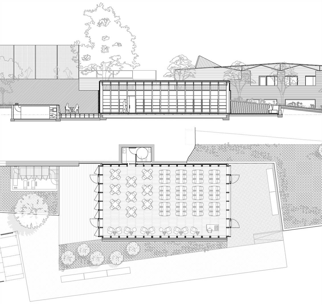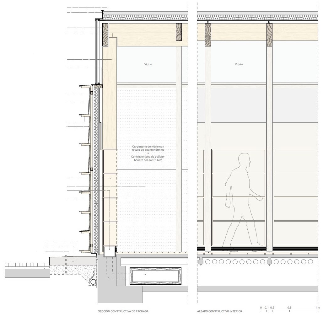LR: Primero hicimos la estructura de madera, como si fuera un cesto boca abajo. Y a la hora de envolverla, necesitábamos hacer un espacio climático contenido y también controlar la vista y el ruido. Pensamos que para mantener la integridad de esta condición de "cesto”, necesitábamos que la fachada y la envolvente estuvieran separadas, puestas por fuera. Y también queríamos seguir trabajando con distintas materializaciones de la madera.
