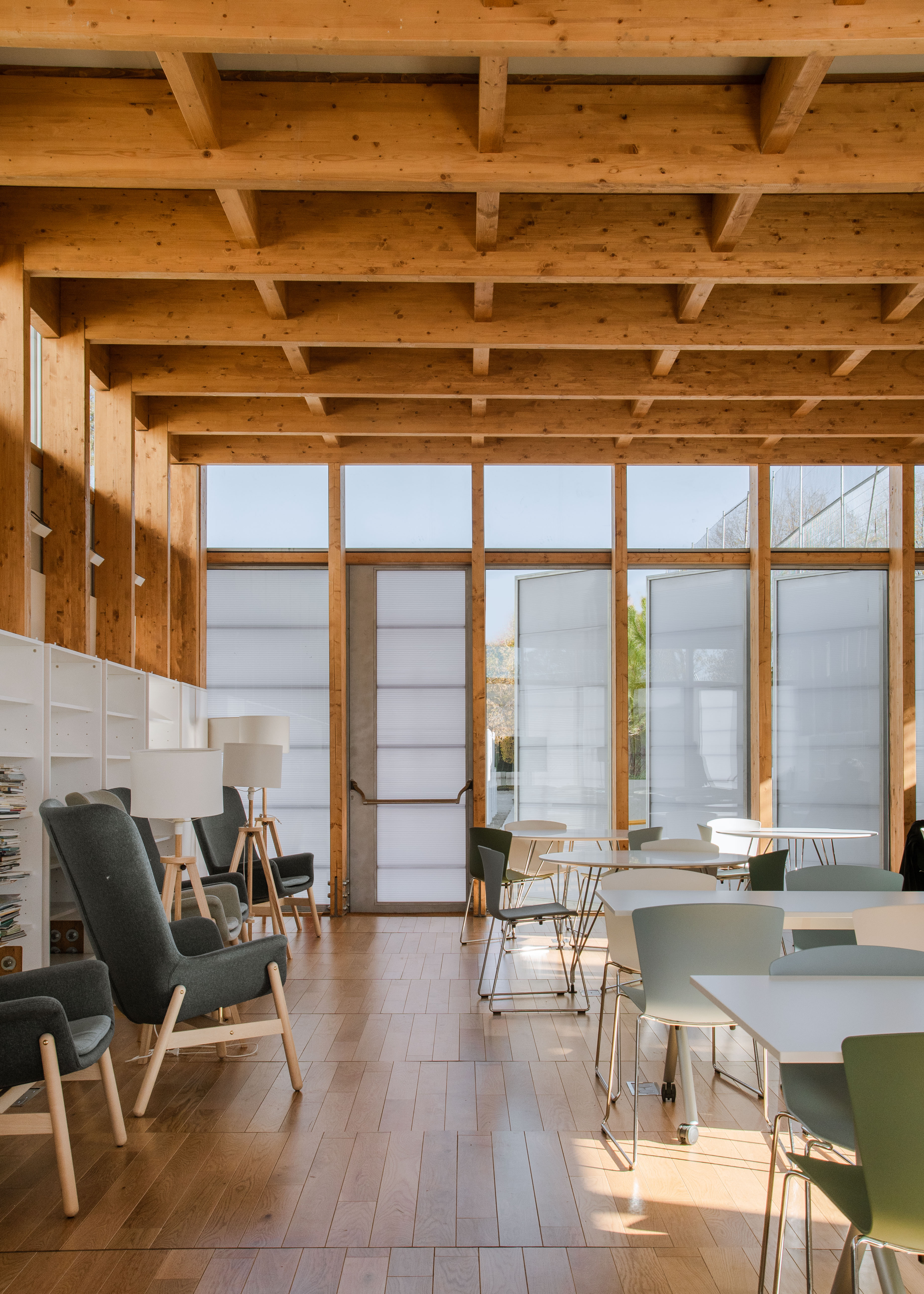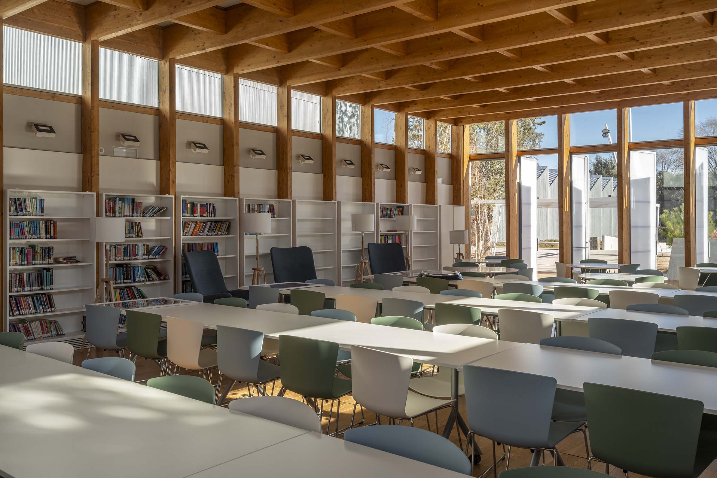 T: Y frente a la materialización de otros edificios, en los que se han utilizado sistemas industrializados metálicos o de prefabricados de hormigón, en la biblioteca habéis optado por la madera. ¿Han pesado las razones sensoriales para esta elección?