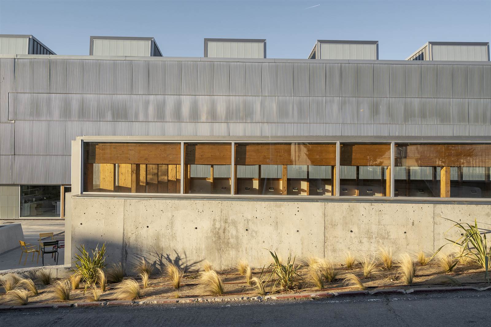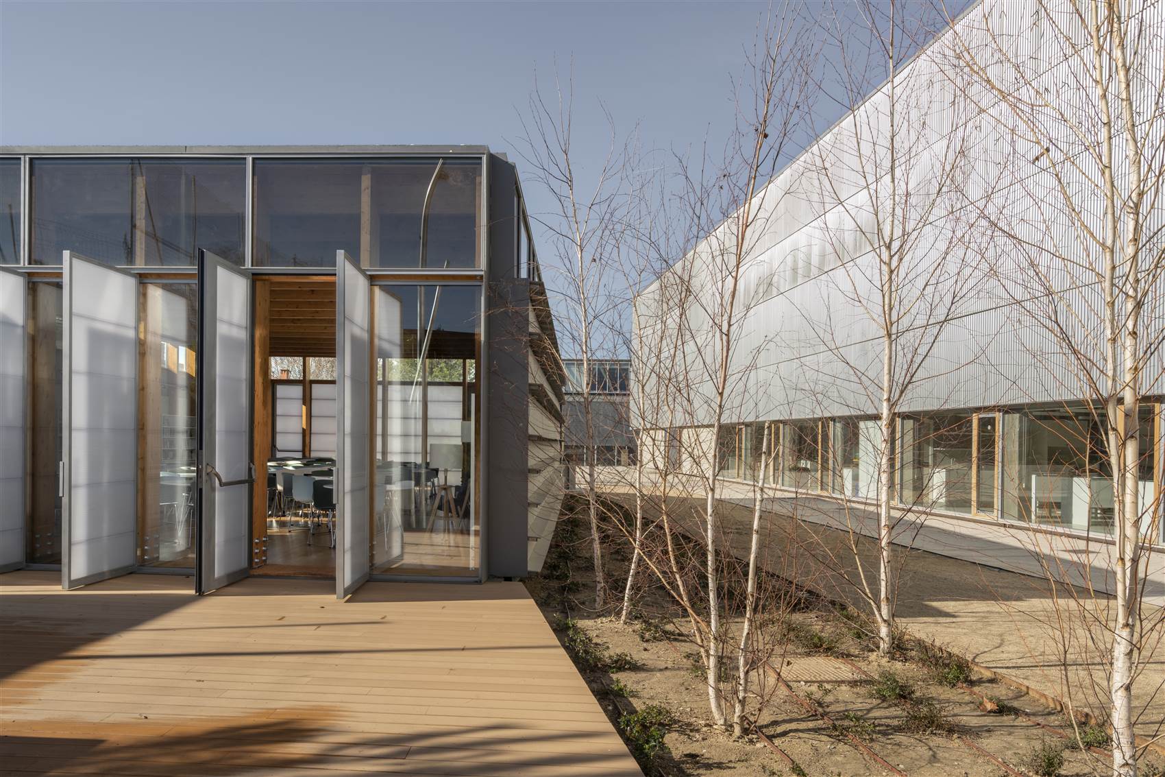 LR: "La envolvente, separada de la fachada, se ha planteado con un lenguaje opuesto: por dentro todo es madera y por fuera es casi todo industrial, metálico-plástico, con la carpintería de acero de Forster, galvanizada, que llega montada para ser atornillada, y el policarbonato."