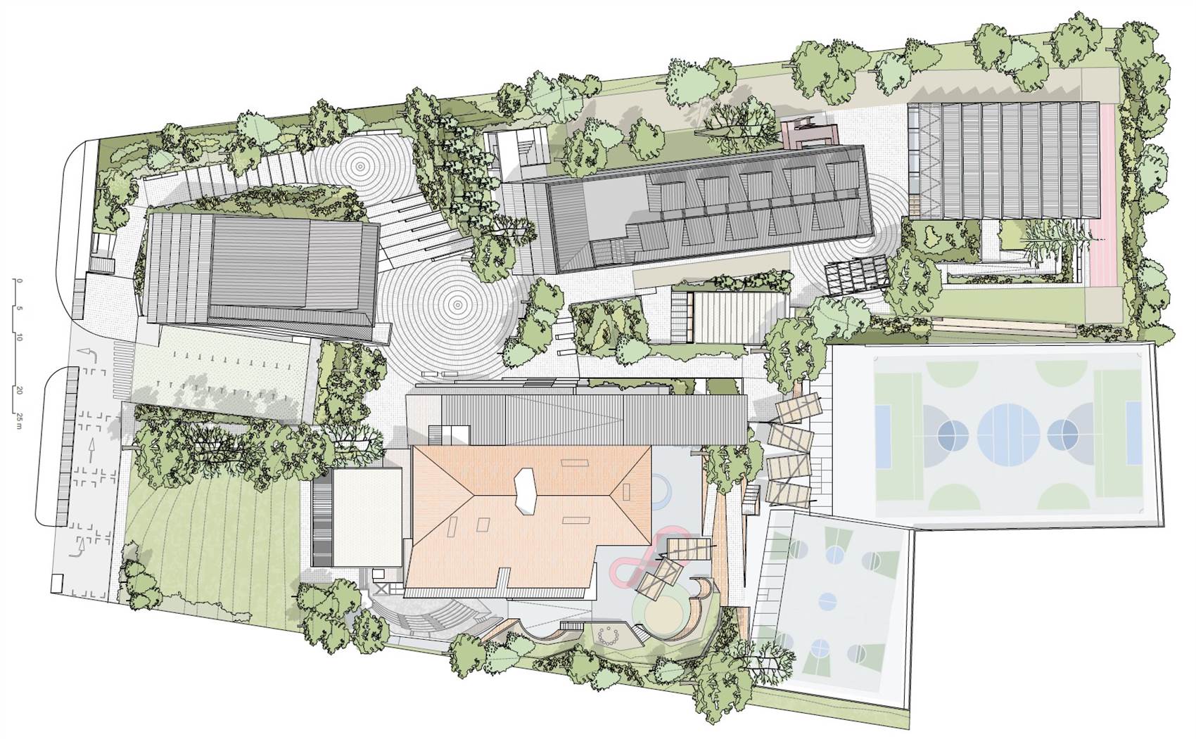 LR: Había un programa inicial, creado por el colegio para transformar sus instalaciones. En la zona Montessori, tenían edificios prefabricados que habían comprado porque no habían encontrado una manera mejor de construir en los cortos periodos de verano. Sabían que querían eliminar los prefabricados, ampliar hacia la nueva parcela del colegio de Legionarios de Cristo, y que necesitaban un edificio y una zona deportiva para novecientos alumnos. Conocían la estructura organizativa, por supuesto, dividida en pre-nursery, nursery, primary school, secondary school, pero sí había cuestiones que se iba reformulando a lo largo de los años.