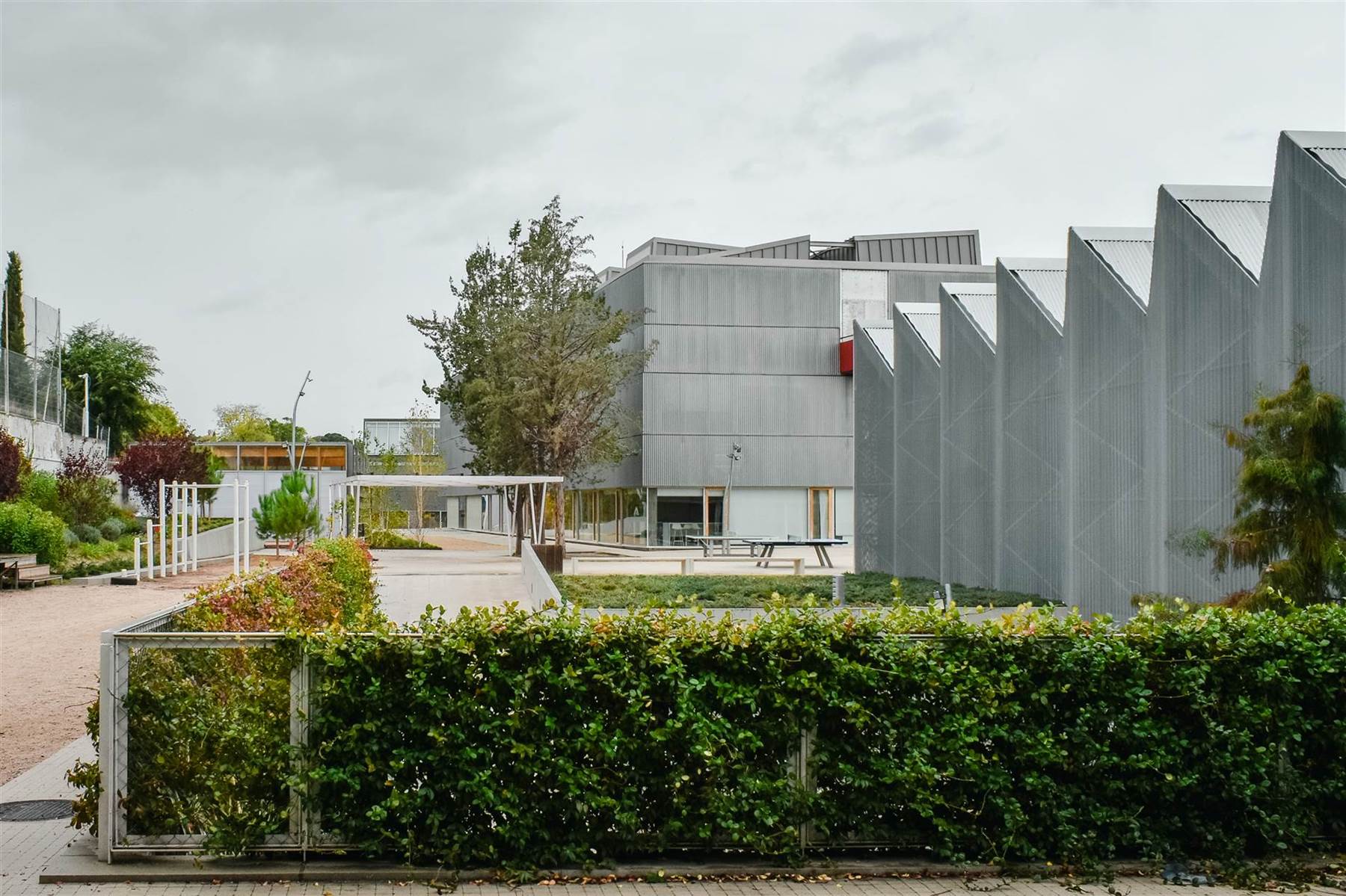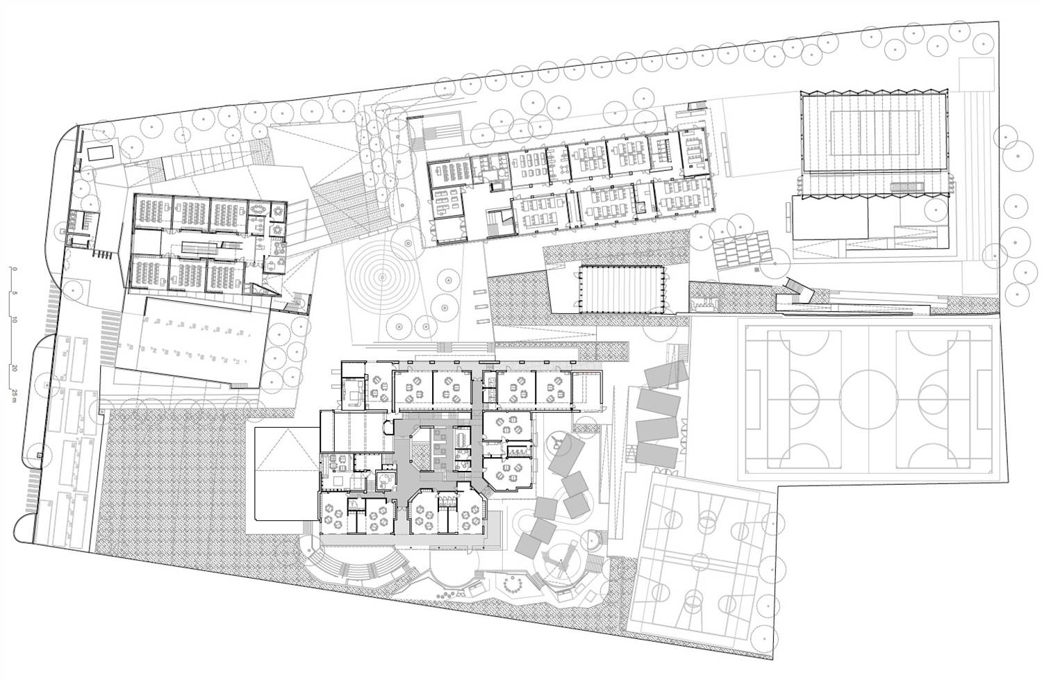 Hay más arquitectura en los vacíos que en los edificios, que están más morfológicamente determinados por su programa. Por eso nosotros hemos insistido intencionadamente en esta posición aleatoria de las cosas, que no es del todo real, porque hay estructuras que estaban de partida, de manera que los edificios no parecieran tan importantes y lo que parece más importante es el marco naturalizado; el suelo, que topográficamente tiene mucha identidad, y este espacio central donde todo el mundo se encuentra, cosa que en un colegio no tiene que ocurrir porque hay mucha estratificación por edades.