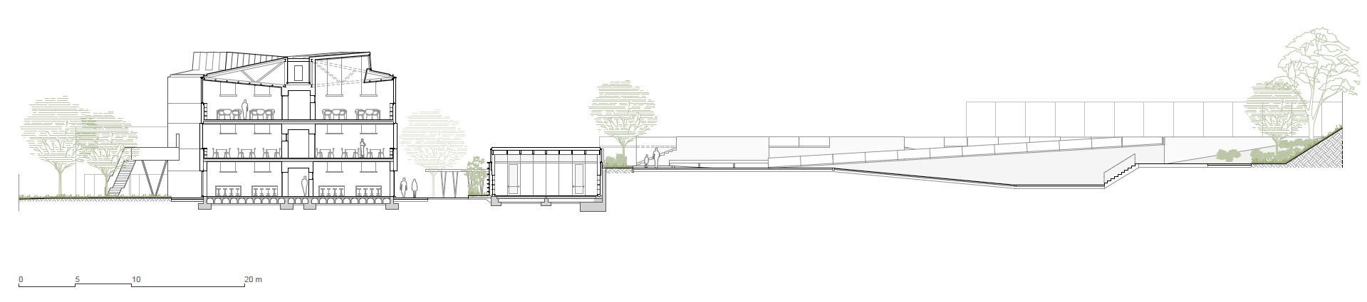 Lo que me preguntabas antes de los espacios de relación y del proyecto paisajístico, sí estaba incluido desde el Anteproyecto. Lo planteamos como si fuese un recorrido que tiene algo que ver con el paisajismo pintoresquista y no con las plazas pavimentadas. Queríamos hacer desaparecer materiales asfálticos y sobre todo soleras, y usar materiales de suelo absorbentes y respetar la topografía. La unión de las dos propiedades, desde abajo hasta arriba y desde una esquina hasta la otra, tiene un desnivel de 9 m, con pendientes muy importantes, y muchos de los edificios están escalonados, porque aceptamos que la forma del terreno determinaría la forma de los edificios. O sea, que la arquitectura no se puede construir sobre plataformas explanadas como si estuviéramos dibujando en un papel en blanco. Esa idea proviene del proyecto moderno, es decir, que la arquitectura es un objeto, el objeto es autónomo y está construido sobre el papel blanco y literalmente se traslada a la construcción como explanación. En este caso, los edificios, se adaptan a los niveles existentes, van cabalgando la topografía hacia arriba de la parcela. Y hay algunos en los que, literalmente, la sección vertical tiene un vacío en el centro con escaleras que reproducen el desnivel del terreno en el que se sitúa.