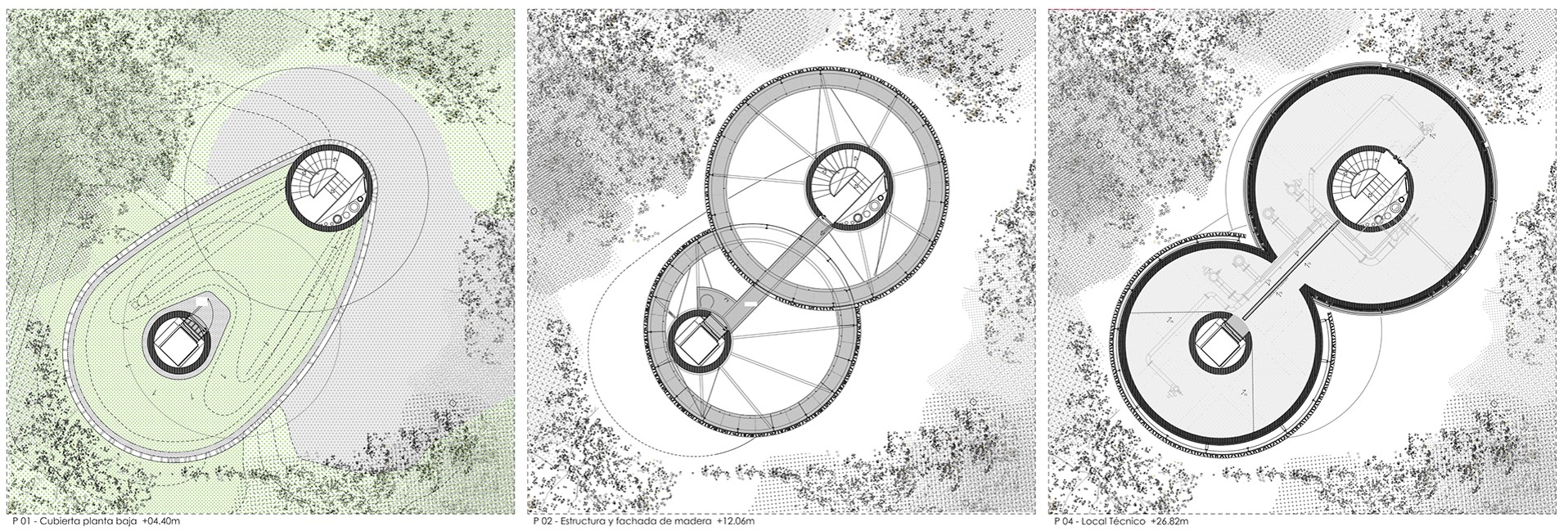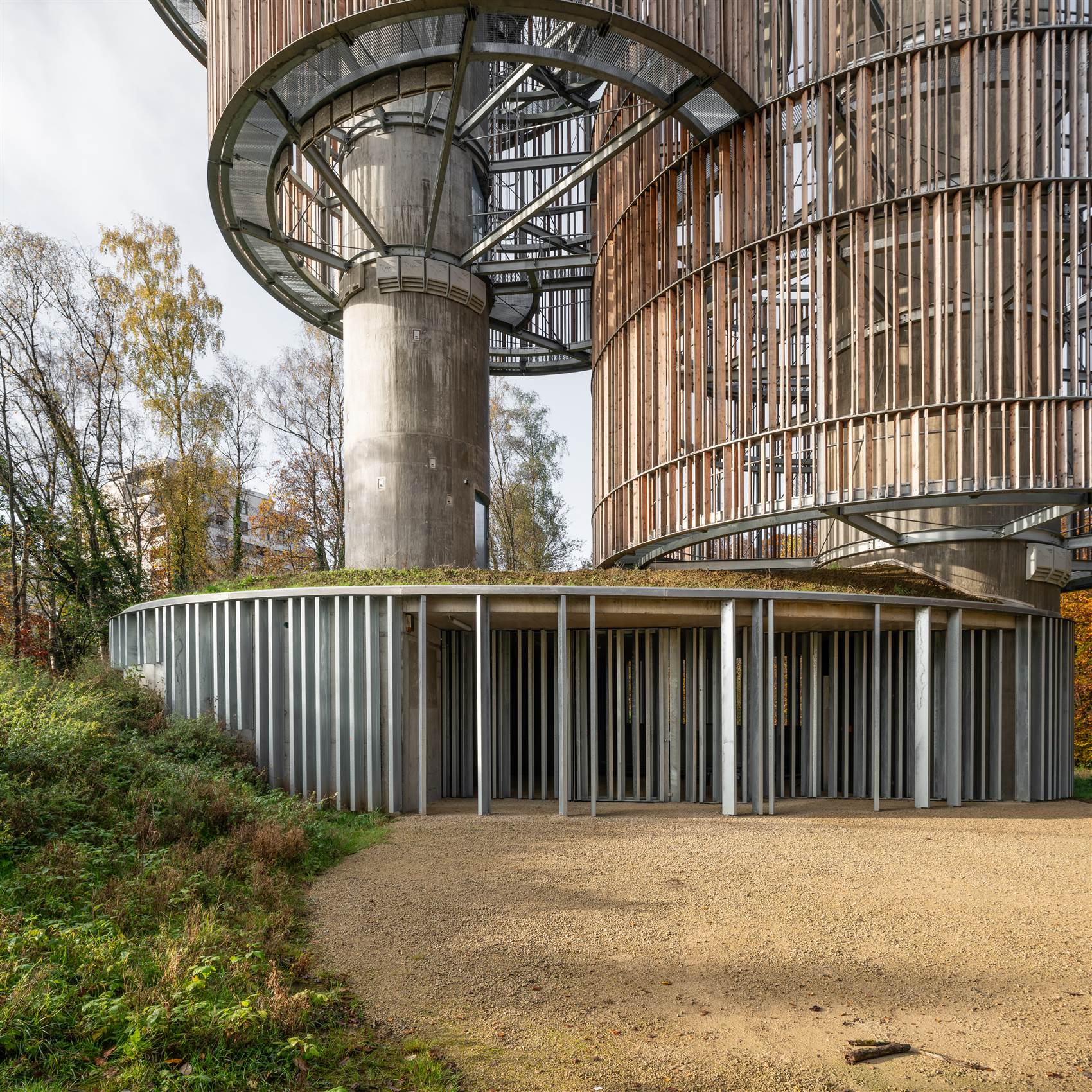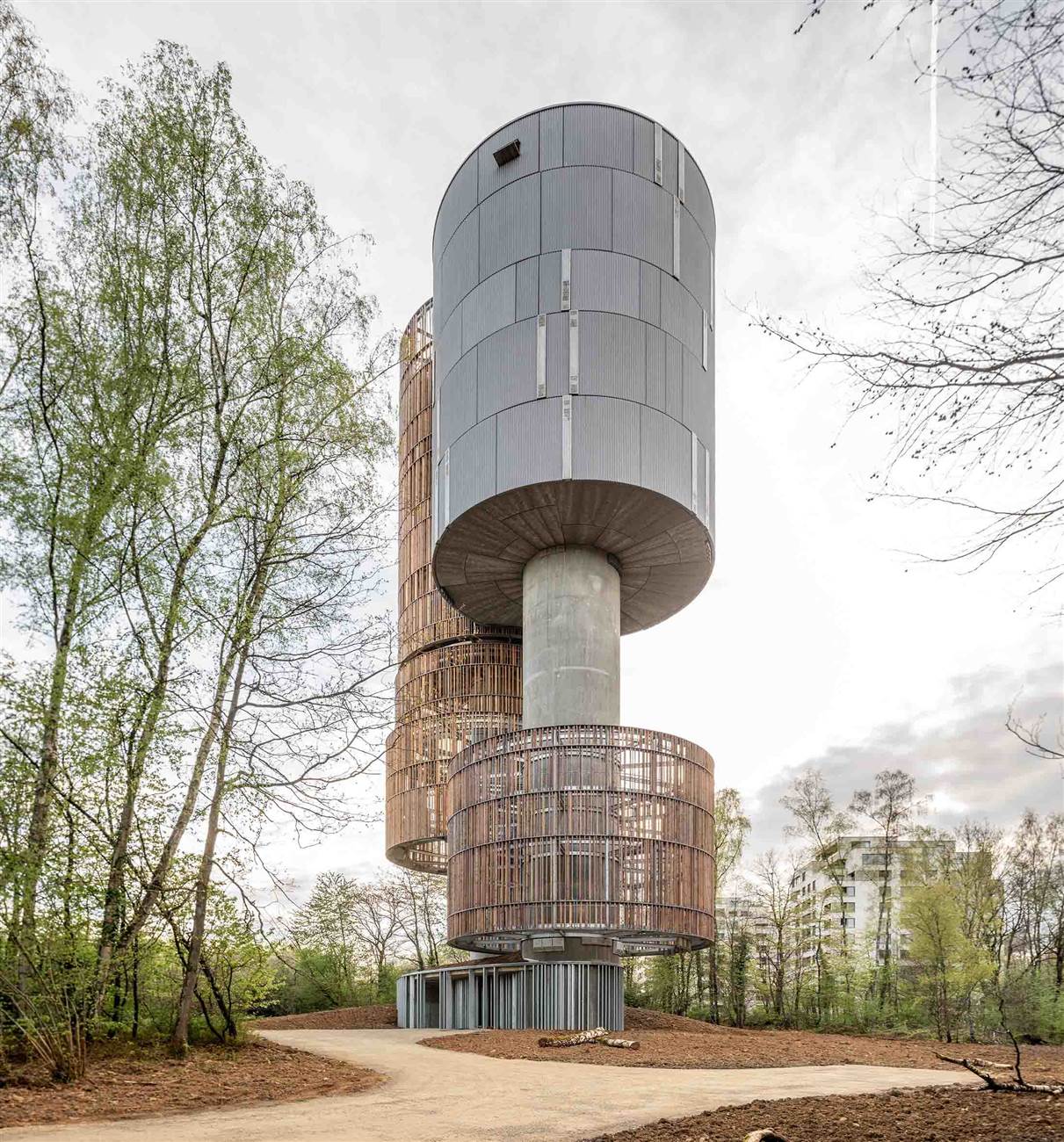 Para resolver el reto de colocar un gran depósito de agua a 50 metros del suelo en medio de un bosque protegido, los arquitectos amann-canovas-maruri y magalhaes, proponen dividir en dos su volumen para minimizar el impacto visual y, como si fuera otro árbol más, revestirlo de madera y construir nidos para servir de refugio tanto a las aves del entorno cercano como a las migratorias, haciendo que el proyecto vaya más allá de una solvente infraestructura urbana, para convertirse, en palabras de sus autores, "en un proyecto más que humano".