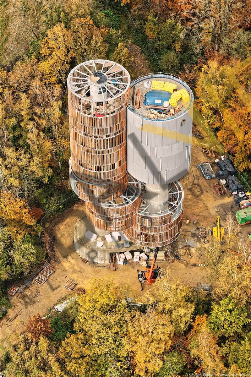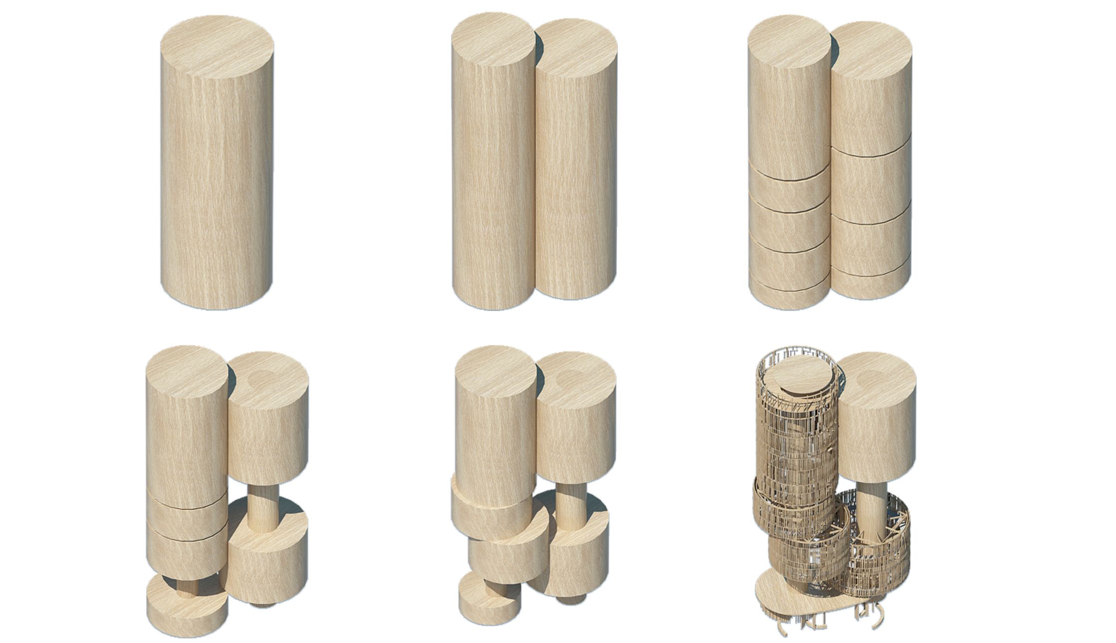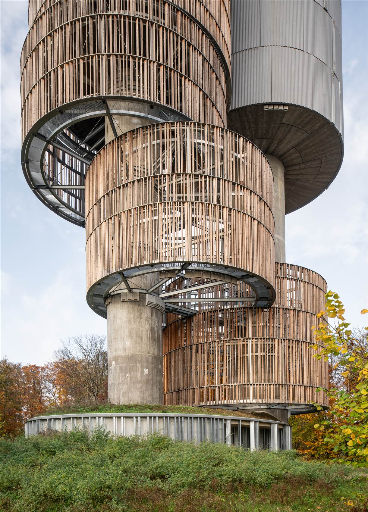 Para resolver el reto de colocar un gran depósito de agua a 50 metros del suelo en medio de un bosque protegido, los arquitectos amann-canovas-maruri y magalhaes, proponen dividir en dos su volumen para minimizar el impacto visual y, como si fuera otro árbol más, revestirlo de madera y construir nidos para servir de refugio tanto a las aves del entorno cercano como a las migratorias, haciendo que el proyecto vaya más allá de una solvente infraestructura urbana, para convertirse, en palabras de sus autores, "en un proyecto más que humano".