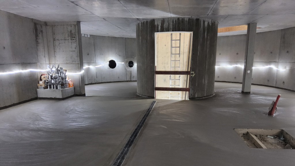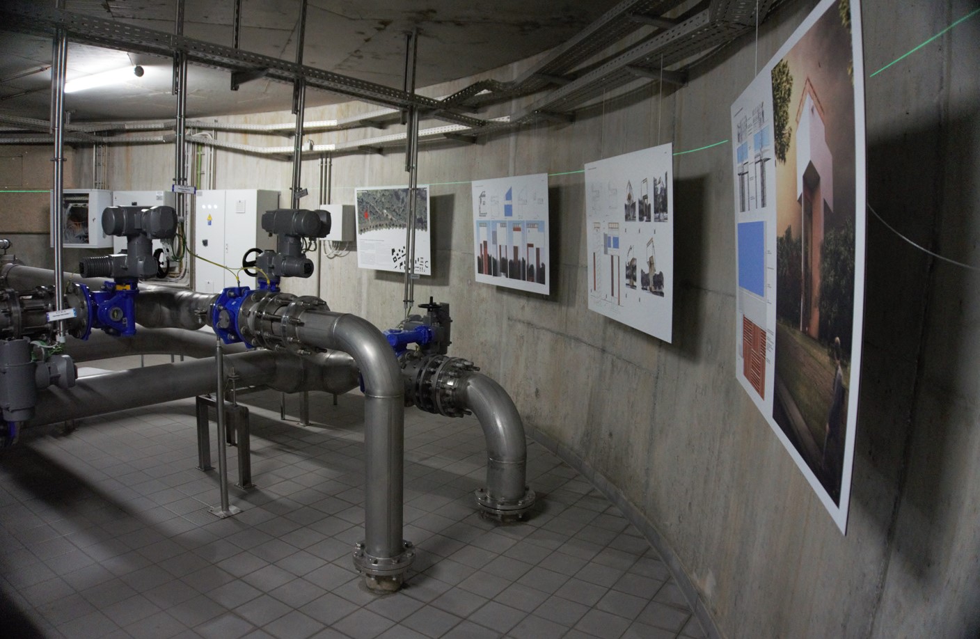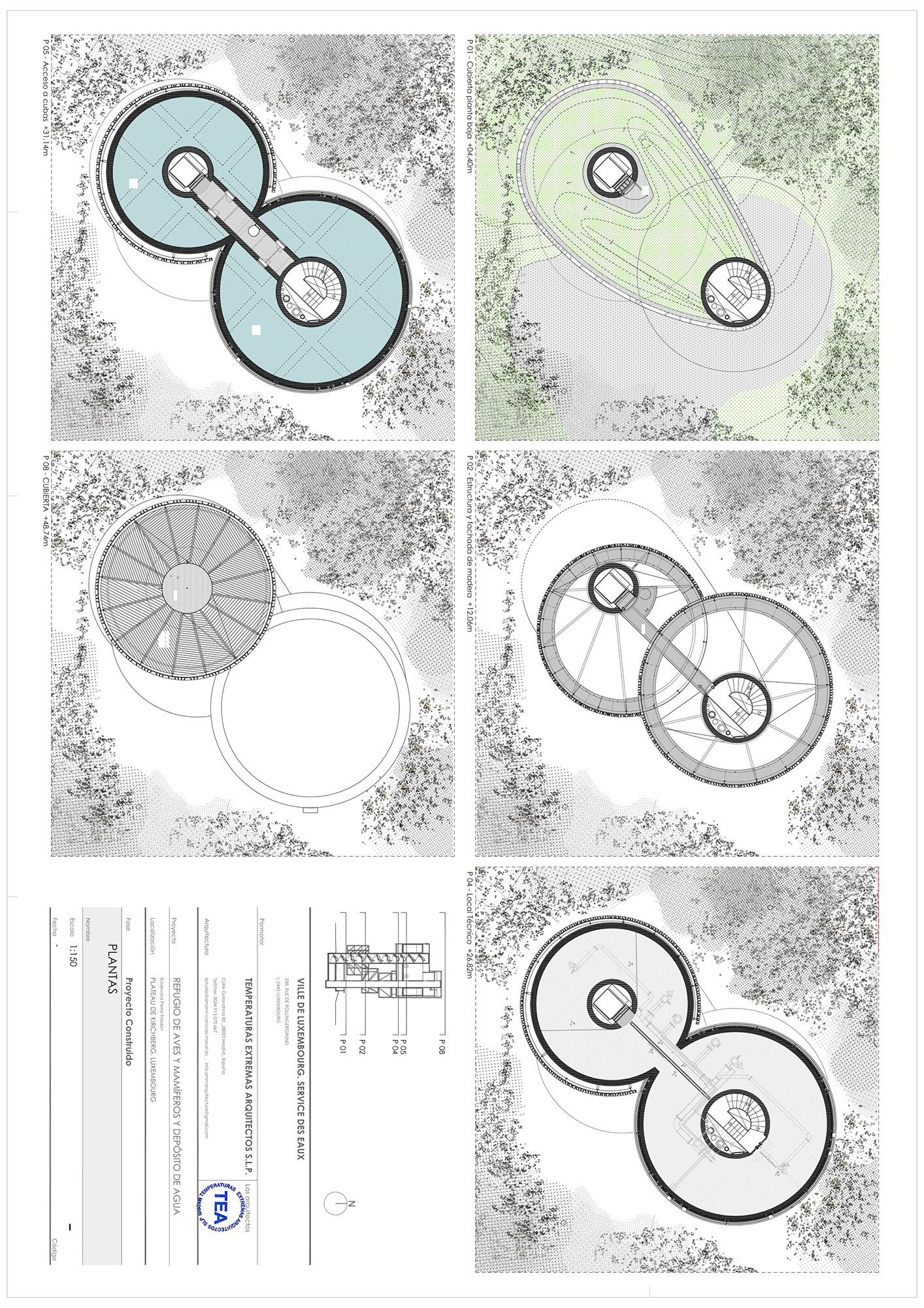 Nicolás Maruri: Luxemburgo está renovando el sistema de agua y los depósitos y, recientemente, ha habido varios concursos de depósitos. Evidentemente, lo más razonable es poner el depósito en la cota de suelo, Pero hay distintas zonas donde no pueden ir a esa cota. Cuando hicimos este concurso fuimos a visitarlos. Al lado de la autopista de circunvalación de la ciudad hay un depósito, un cilindro blanco, forrado en aluminio, muy atractivo. Aquí la cuestión era que, al estar en un terreno protegido, en el límite con la ciudad, lo que se pretendía era no ocupar mucho terreno, por lo que no era viable la solución de hacer un depósito extendido.