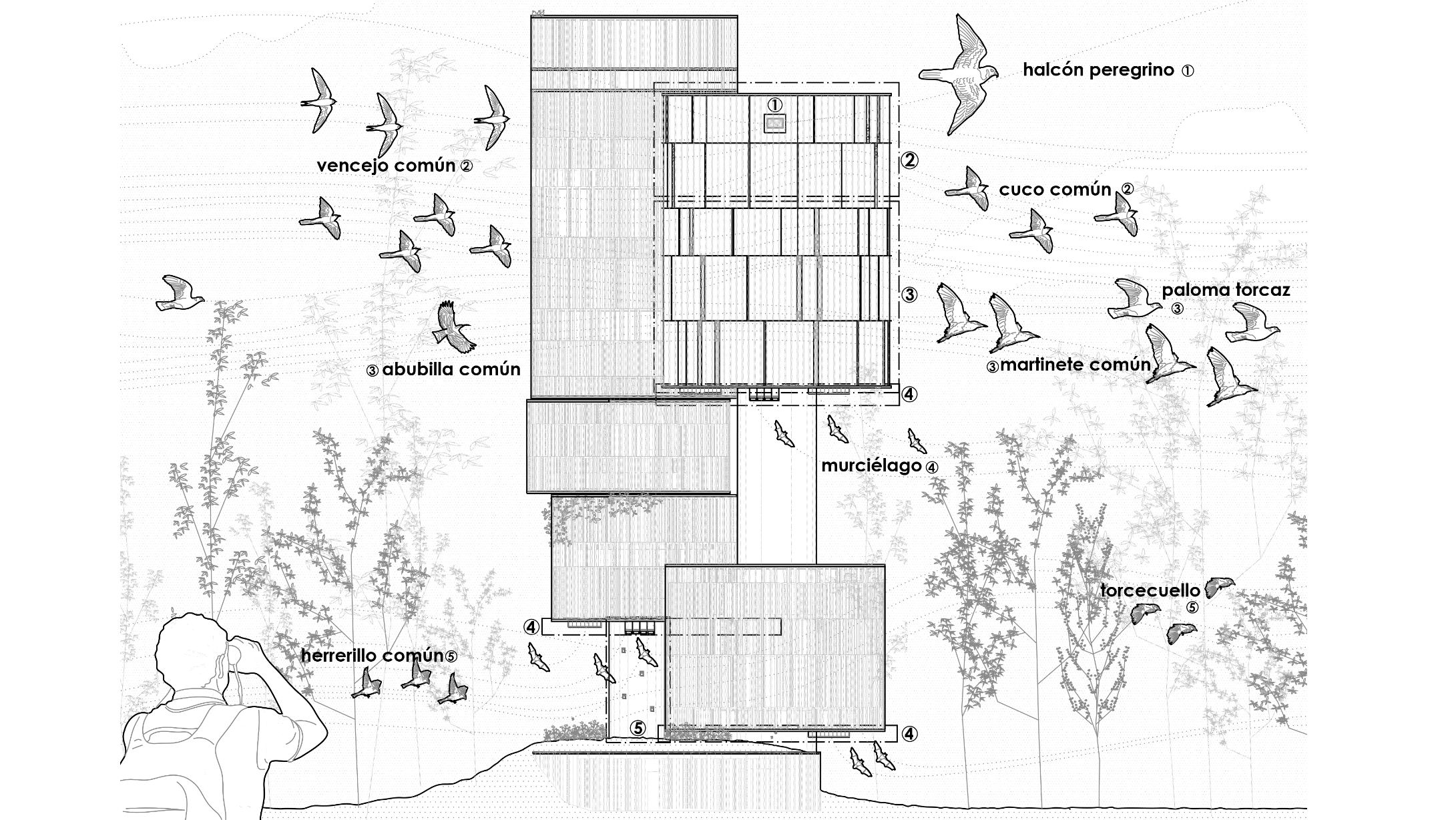 "El programa se separa en dos volúmenes diseñados según las más estrictas especificaciones técnicas. El primero se resuelve con una piel de hormigón prefabricado y rugoso en la que se insertan ordenadamente nidos de golondrinas a distintas alturas y con orientaciones precisas. También en este volumen se construye a 50 metros de altura un nido para los halcones peregrinos. Tanto los materiales como los lugares están estudiados por grupos de naturalistas y ornitólogos que complementan al equipo de diseño".