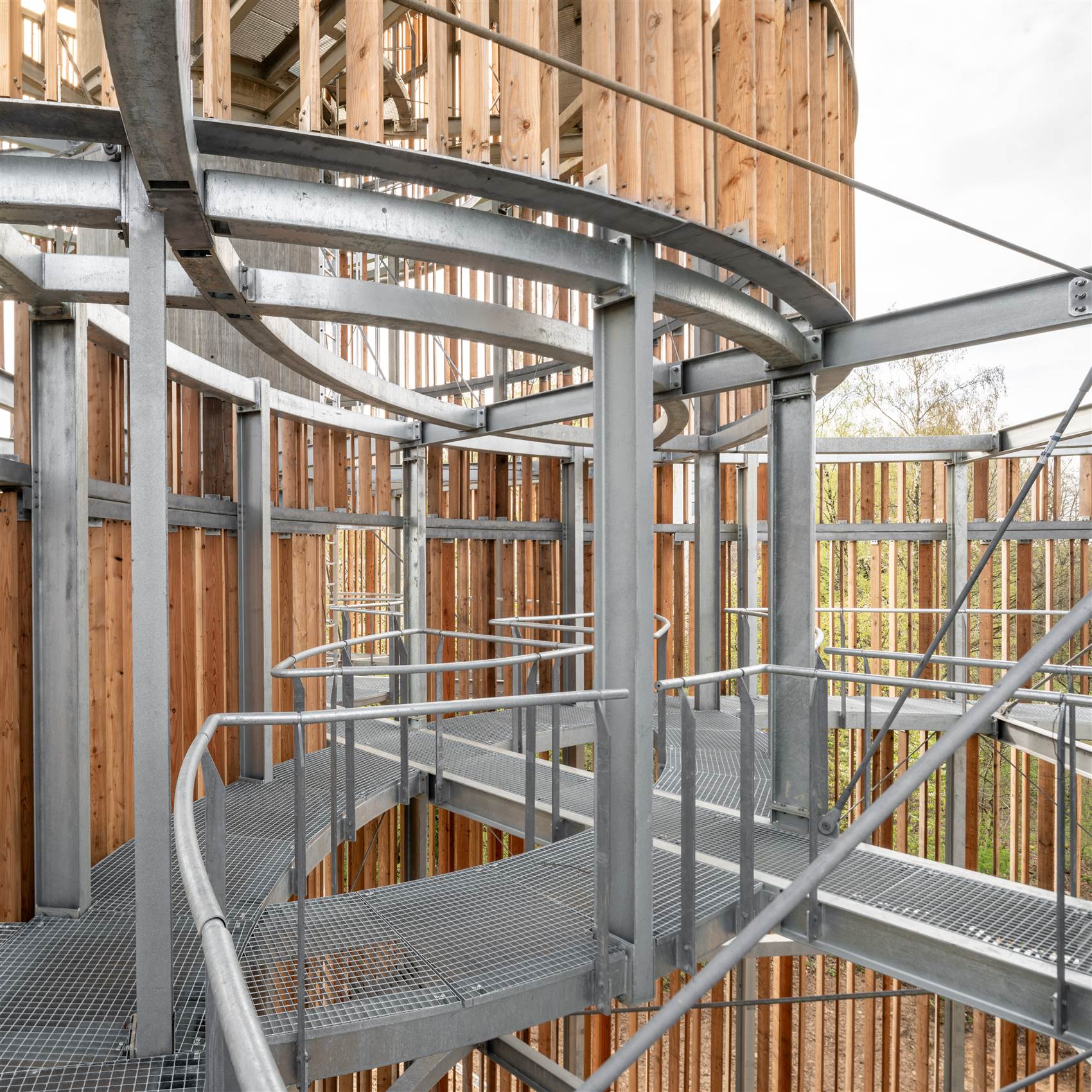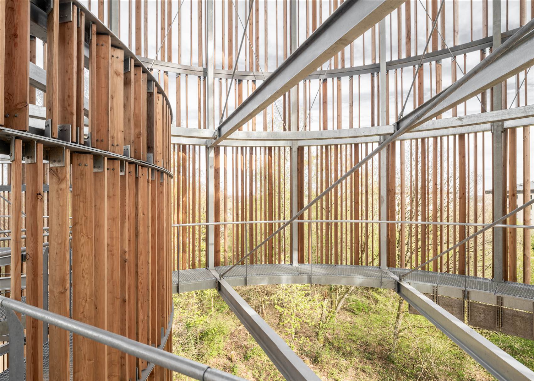 AC: Realmente está vacío; no hay nadie trabajando. Todo se lleva desde las oficinas centrales. En la primea planta del depósito hay un almacén, un aseo, el ascensor y una escalera; en el sótano hay un primer sistema de impulsión de agua que conecta directamente con la red, y, por encima, están los dos depósitos con dos grandes espacios arriba y abajo. La zona de abajo se recubre con unas piezas de acero en L que se abren para permitir un cierto paso de animales, y no se utilizó madera porque es un elemento crítico y exige un grado elevado de seguridad. De todos modos, se puede visitar bajo petición al servicio de aguas. De hecho, para eso está la terraza. El ascensor lleva directamente a la última planta, sin pasar por ninguna zona técnica, en la que la densidad de la madera es menor para permitir disfrutar de la vista, que es espectacular porque, además de a los pájaros, se ve todo Luxemburgo.