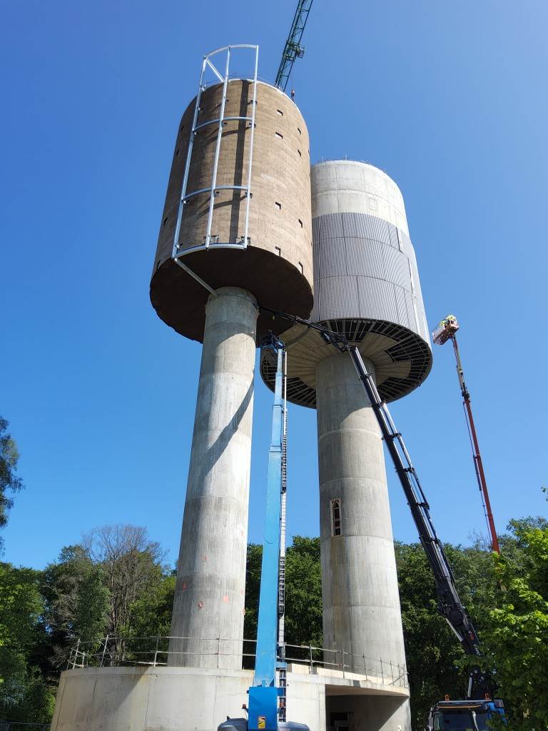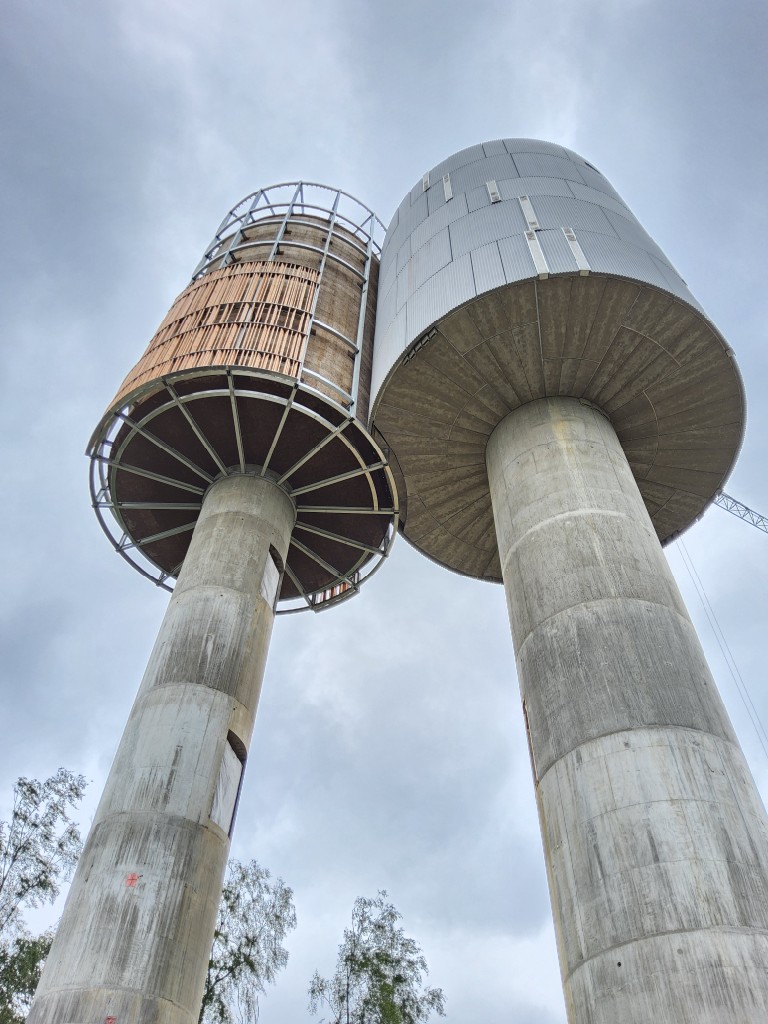 AC: No, son dos depósitos separados, uno de 400 m3 y otro de 600 m3, absolutamente independientes. Y, eso está bien porque se puede limpiar un depósito o hacer trabajos de mantenimiento en uno, y seguir trabajando y dando servicio de agua con el otro. Lo que si hay es una conexión física porque hay dos fustes: uno con el ascensor y en el otro hay unas escaleras con un pasillo por medio, en la secante de los dos depósitos, de tal manera que la gente que lo mantiene no tiene que pasar de uno a otro, sino que se comunican, y uno de ellos, tiene arriba una plataforma de observación y de control. Y eso ayuda también a la estabilidad estructural.