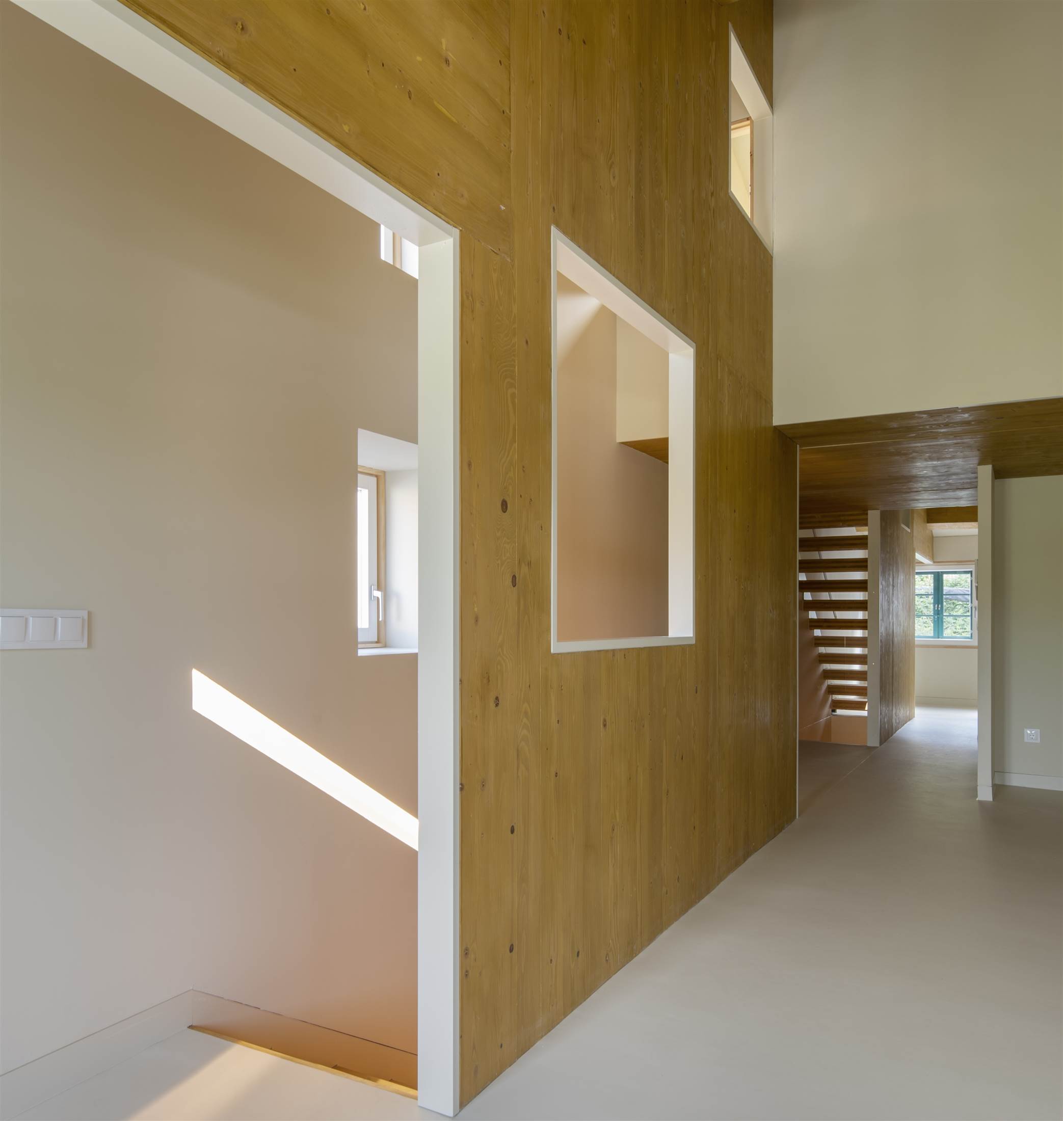 Mediante el derribo de una parte del forjado, se libera un doble espacio que aporta altura e iluminación natural cenital. El vaciado de este forjado no tiene ninguna afectación en la estructura ya que se mantienen todas las vigas de madera originales y se aprovecha el entrevigado más amplio, que había contenido la escalera original, para situar la nueva escalera.