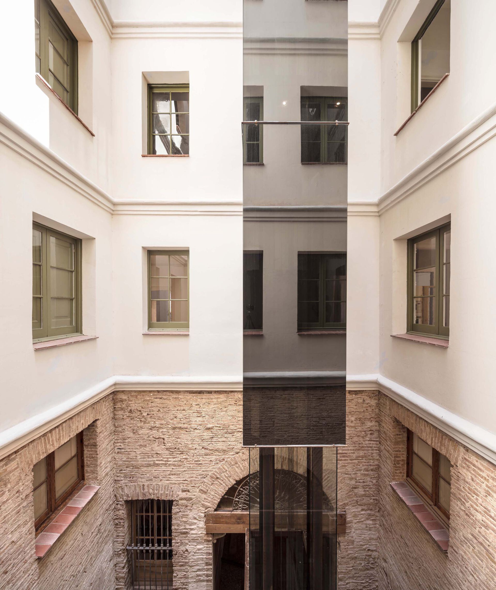 Las ventanas y puertas son conservadas prácticamente en su totalidad. Cuando esto no es posible, se sustituyen, total o parcialmente, por nuevas carpinterías de madera de pino que exhiben en el espacio su materialidad. Durante la retirada de postizos se decide sumar a la propuesta el afortunado encuentro de algunas presencias que explican la memoria del lugar: es el caso de la habitación azul, de las texturas verdes de la autodenominada habitación del pánico o de algunas primeras pinturas de fabulosa riqueza cromática que han aparecido decapando algunas paredes.