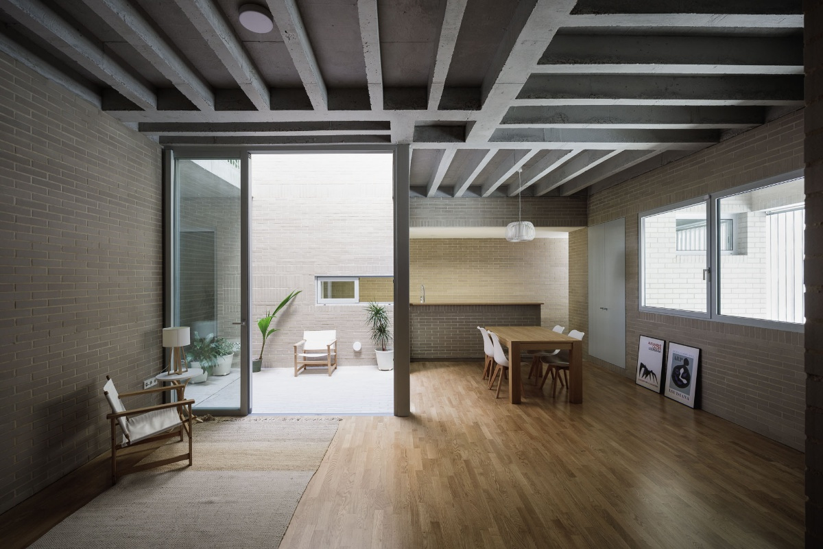 El estudio de arquitectura Andrés Alonso consigue, tras una estructura sencilla y de probada eficacia de entramado de hormigón y fábricas de ladrillo, un cuidadoso conjunto residencial caracterizado por el uso extensivo del ladrillo de 3centímetros sobre suelos y fachadas.