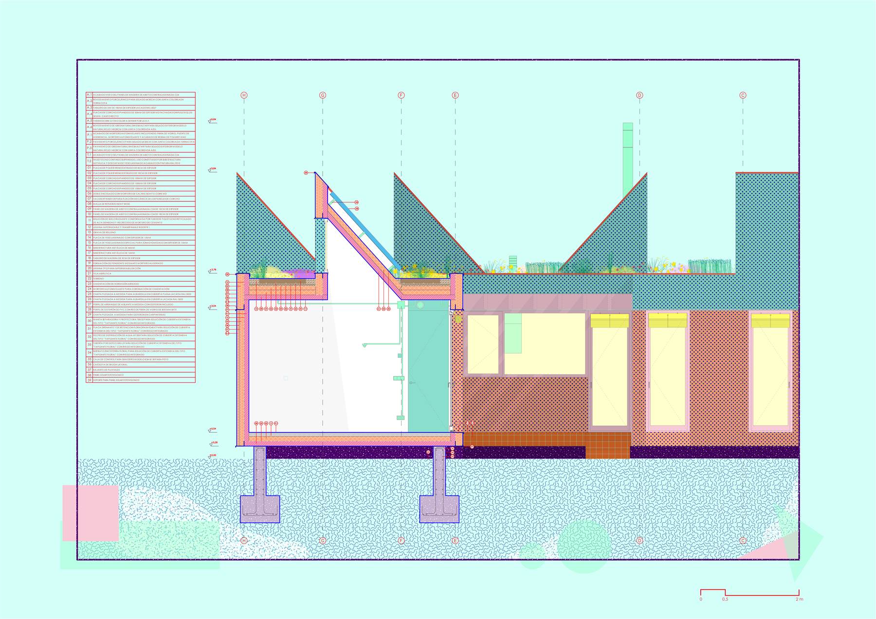 La mayoría de las uniones se realiza mediante construcción en seco, lo que permitirá el desmontaje y reciclaje de una gran parte de los componentes, facilitando la posibilidad de participar en el futuro de una construcción circular. A fin de reducir el impacto ecológico, se restringe el número de capas de recubrimiento a las estrictamente imprescindibles, dejando a la vista tanto la madera estructural contralaminada como las redes de instalaciones. La limitación material se toma como una oportunidad para explorar otras estéticas sin renunciar a la dimensión afectiva de los espacios interiores y exteriores"...