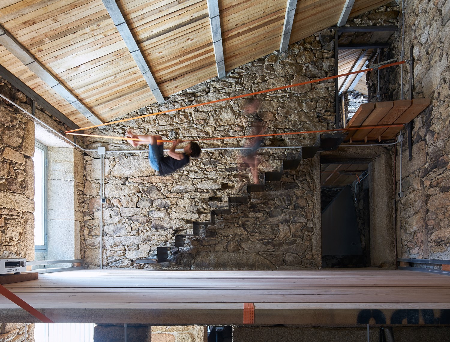 La biblioteca como elemento protagonista sirve de elemento estructurante en el reparto espacial del programa funcional. Una espina central de dos alturas de 1,35 m de ancho y 4,30 m de alto sigue la traza de la cumbrera recorriendo la nave de testero a testero acotando dos espacios.